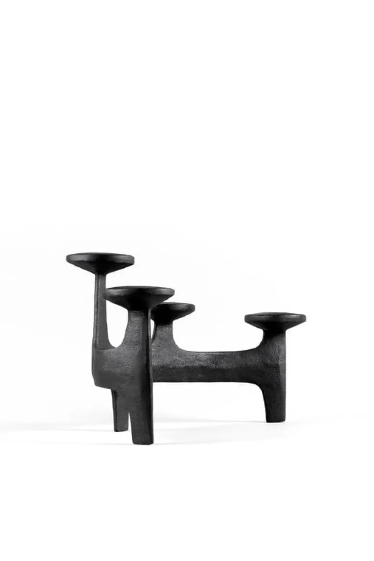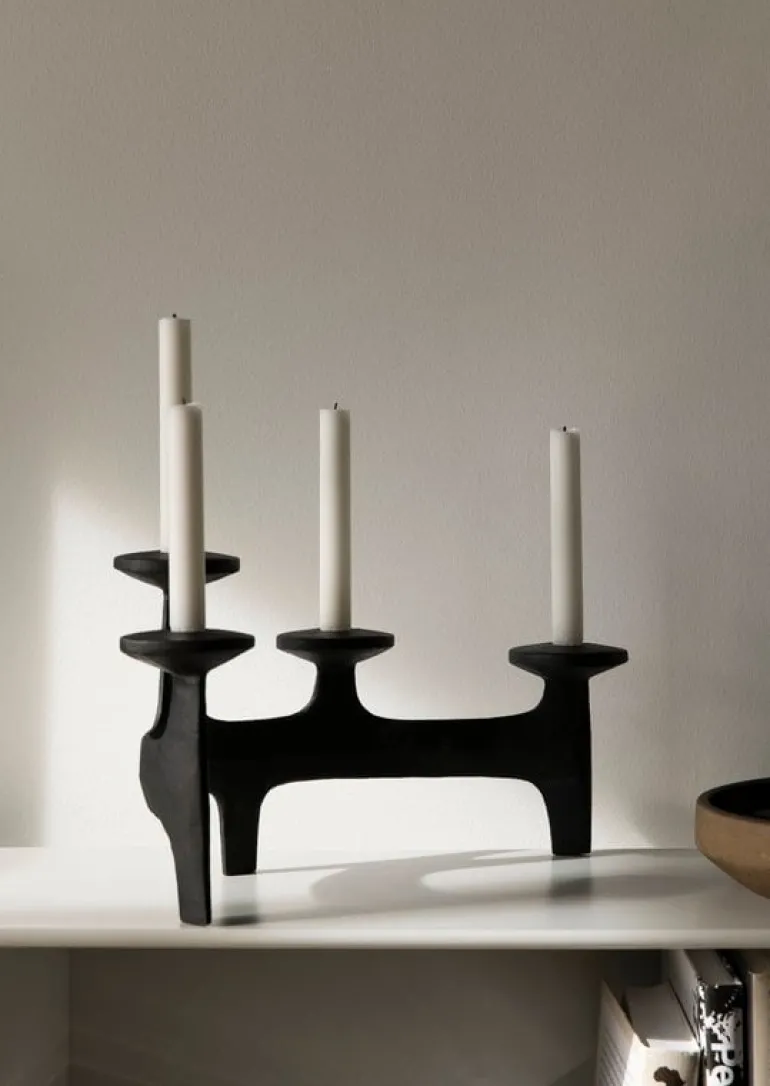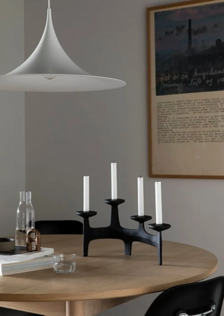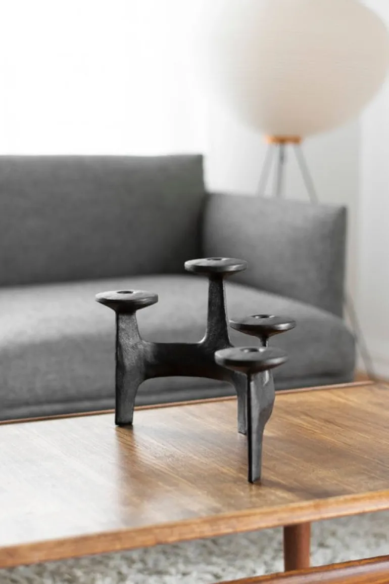 Kandelabern Nunatak, från Nedre Foss, kommer garanterat att skapa en festlig stämning vid olika tillfällen. Den fyrarmade kandelabern är tillverkad av stabilt gjutjärn och är designad av det norska designbolaget Anderssen & Voll. Den arkitektoniska, men ändå organiska formen kan uppfattas som en grupp med torn eller som de unika formerna av hjorthorn, beroende på betraktarens öga. Namnet på kandelabern kommer från Nordens naturlandskap – Nunatak syftar till en kulle eller ett berg omringat av glaciäris. Välj dina favoritljus av avsmalnande modell och låt det milda skenet förgylla ditt middagsbord eller vardagsrumsbord.