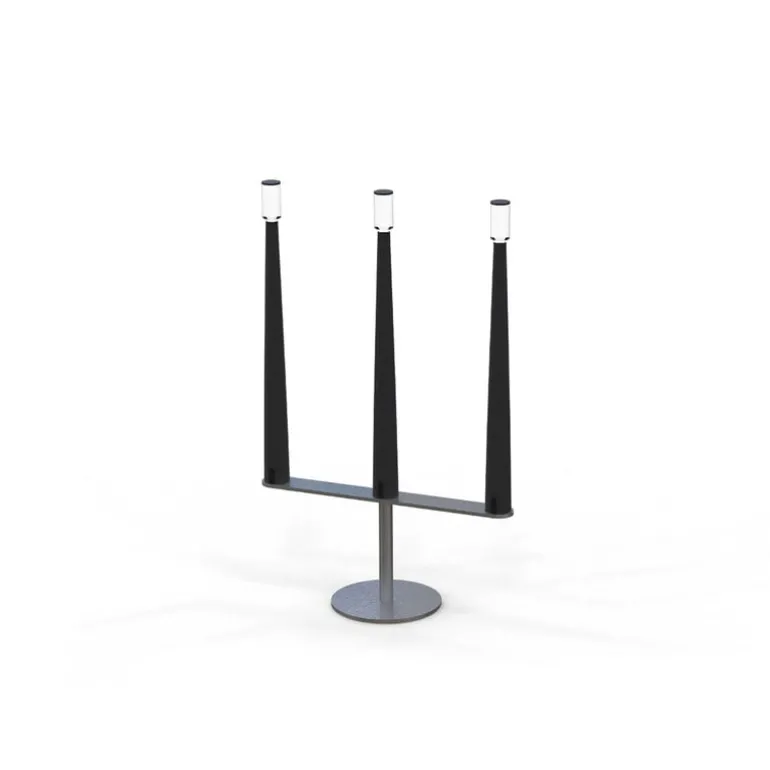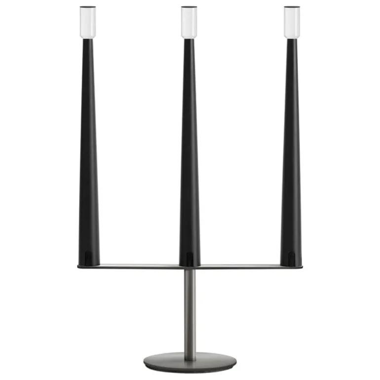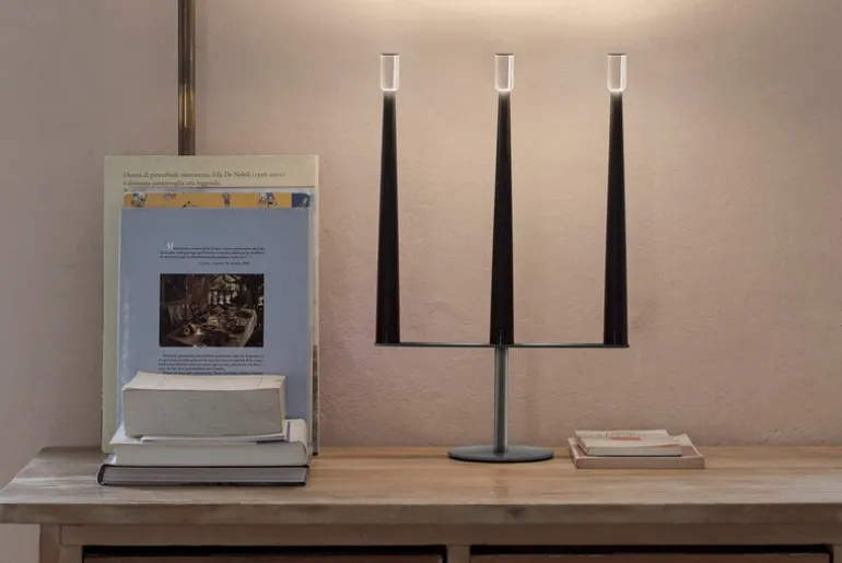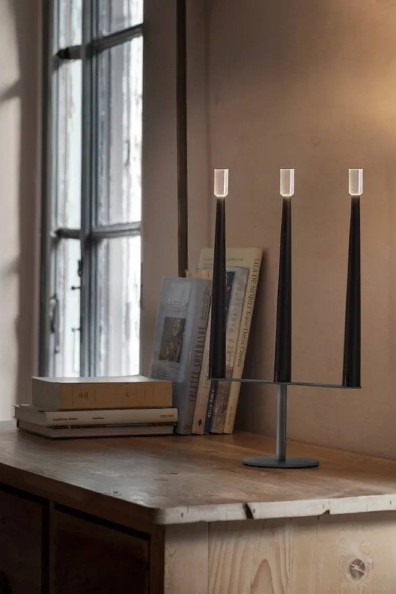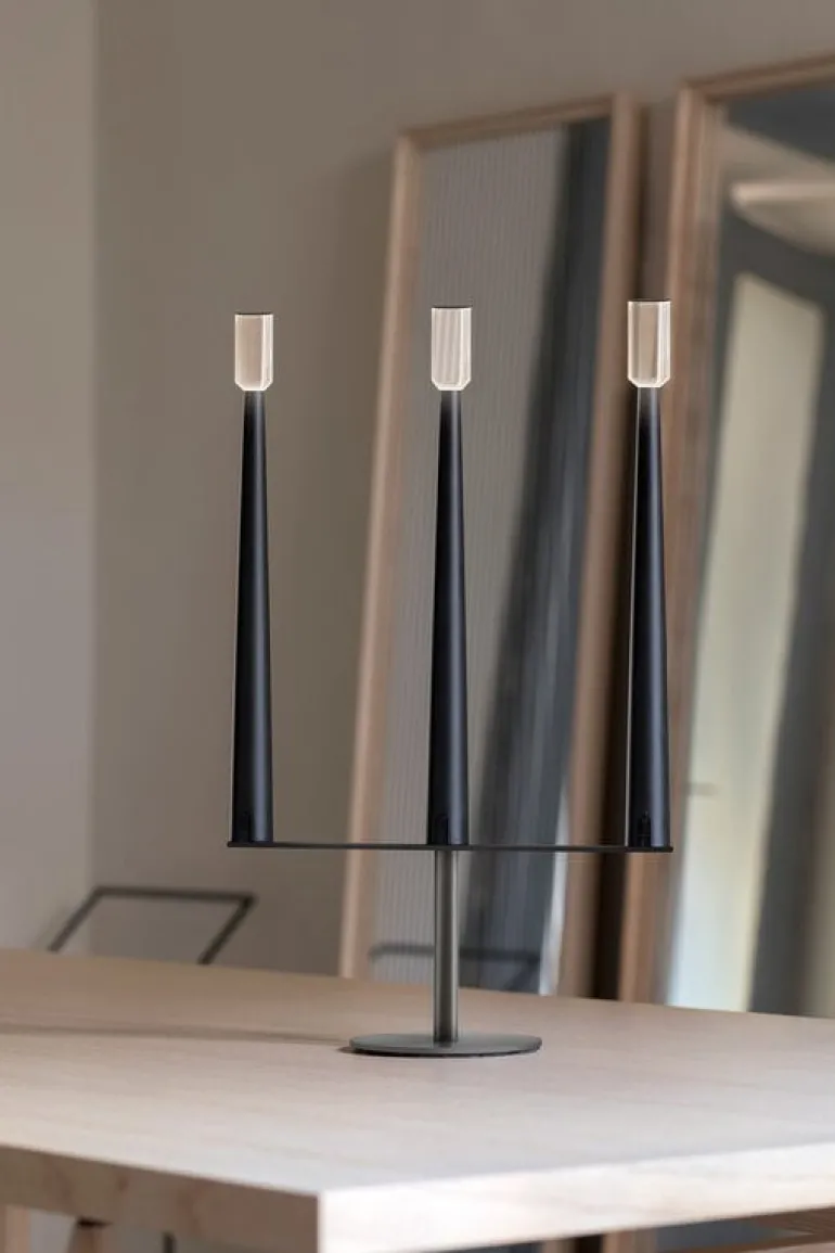 Nemo Lightings Sorrento är en bärbar bordslampa med en trearmad design som påminner om en klassisk ljusstake. Aluminiumarmarna toppas med genomskinliga diffusorer som låter ljuset flimra mjukt, precis som lågan på ett ljus.
