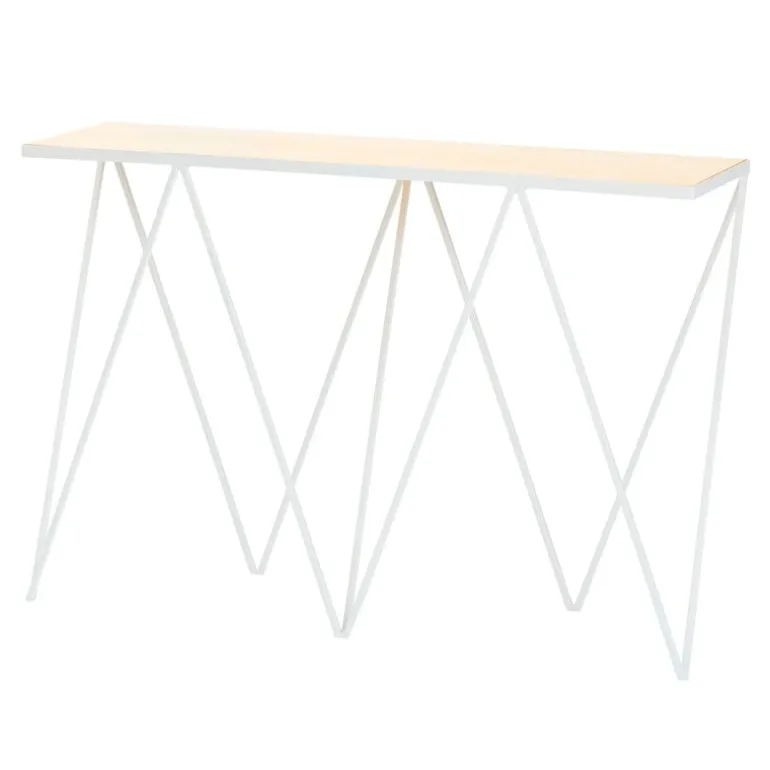 Konsolbordet Giraffe från &New förtrollar med sin starka och lekfulla form. Bordet består av en bordsskiva i furu och elegant formade zigzag-stålben, vars tunnhet och längd påminner om benen på en giraff. Benens geometriska design säkerställer att bordet, trots sin smala storlek, står stabilt på plats.