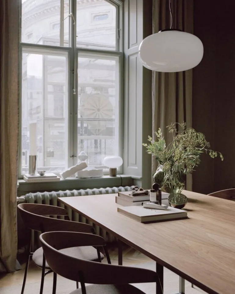 Karl-Johan-pendeln från New Works kännetecknas av en mjuk, rundad form inspirerad av naturen: designad av Signe Hytte, har lampan lånat sin form från hatten på en svamp. Den eleganta armaturen är tillverkad av munblåst glas, känt för sin nyckfulla natur – detta ger varje lampa en unikt vacker närvaro som, trots enkel form, är nästan poetisk. Den minimalistiska Karl-Johan-pendeln ger en distinkt nordisk touch till alla utrymmen, oavsett om de är privata eller offentliga.