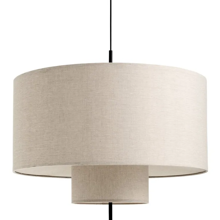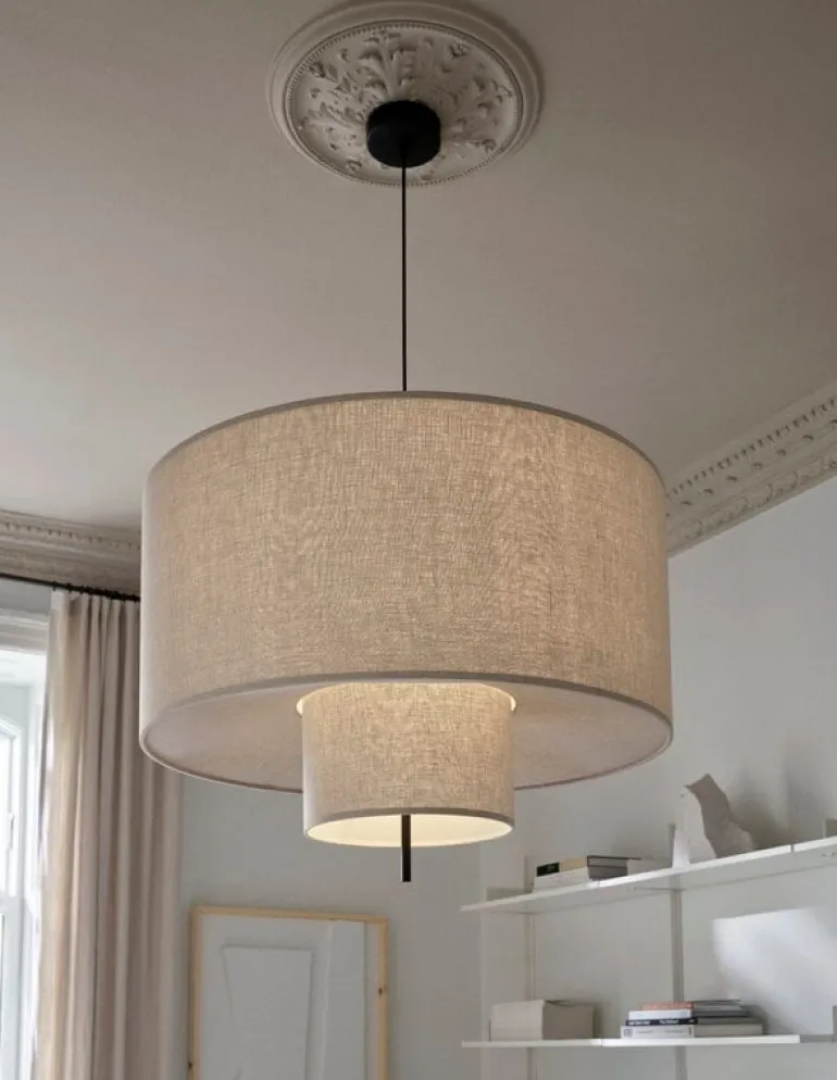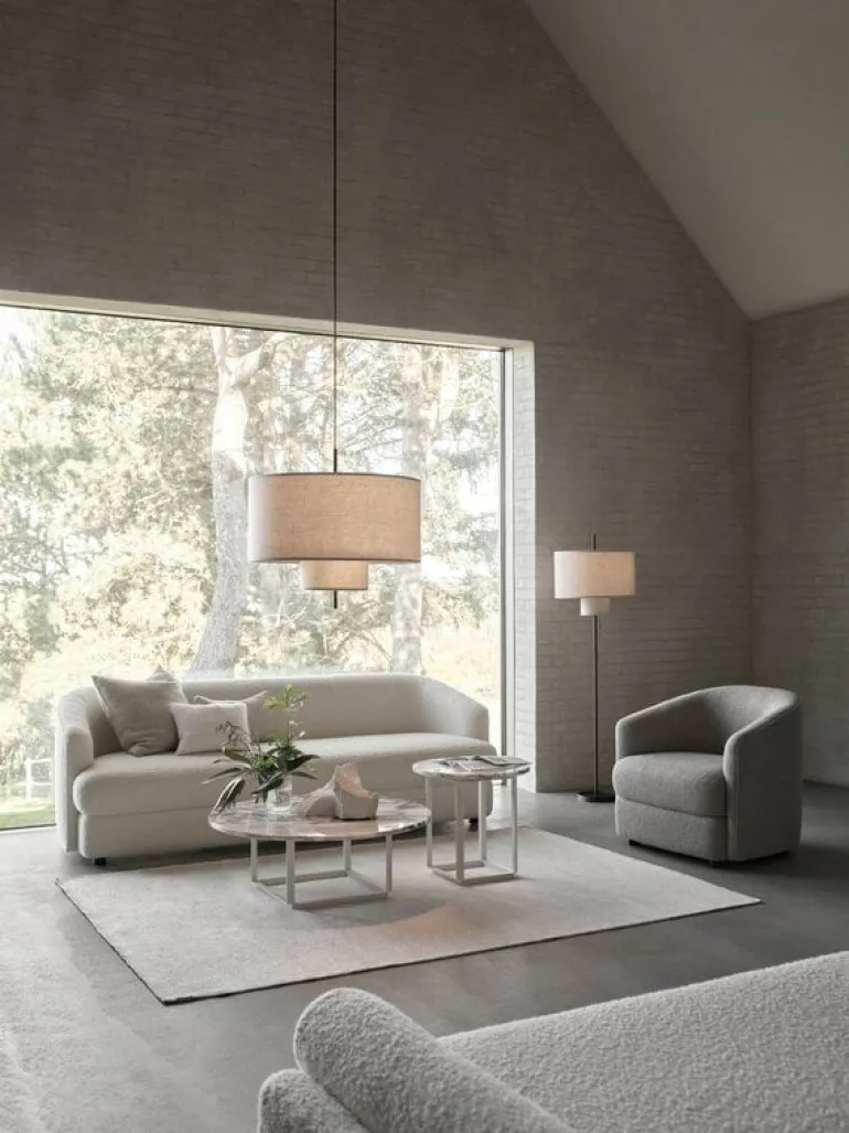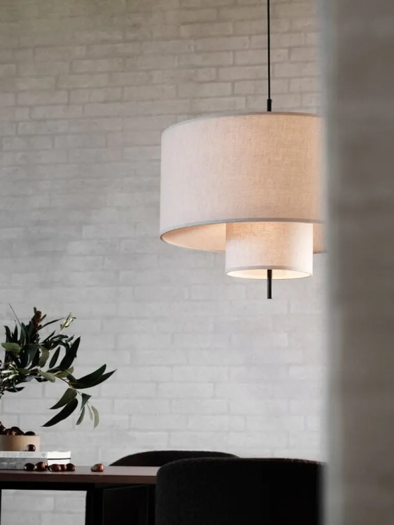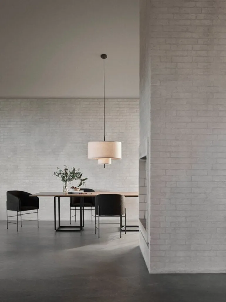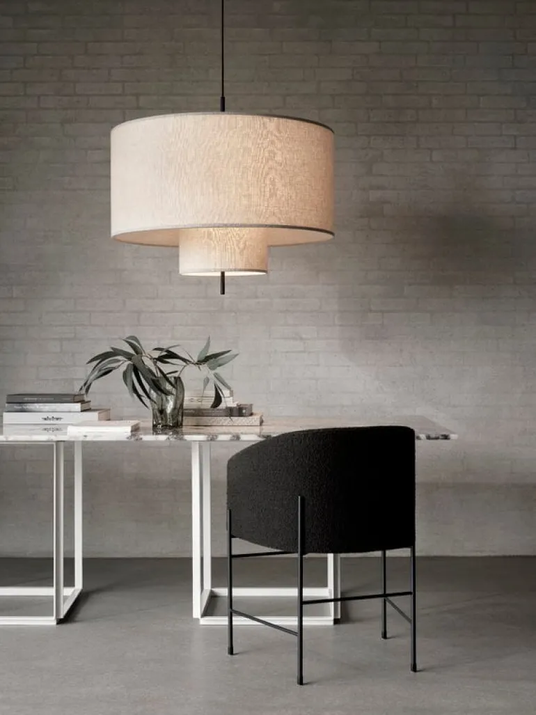 Taklampan Margin från New Works, designad av John Astbury, har en stegvis textilskärm som sprider ljuset på ett behagligt, mjukt sätt, vilket skapar en varm och inbjudande atmosfär i rummet. Skärmens subtila, klassiska uttryck kontrasteras av den raka linjen som skär igenom den, vilket understryker skärmens geometriska form och lägger till en gnutta drama till lampans silhuett.