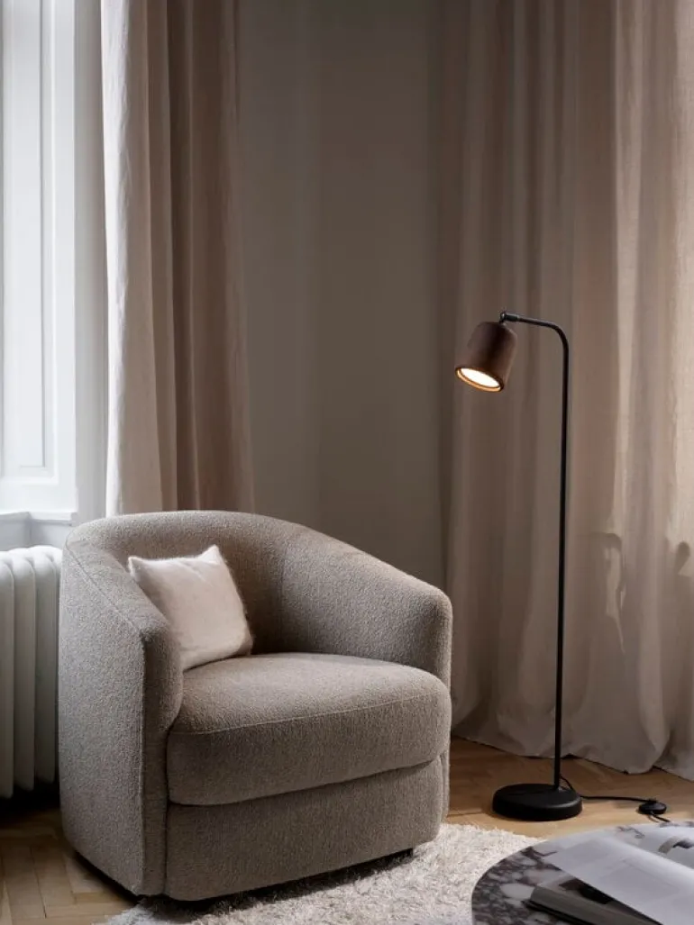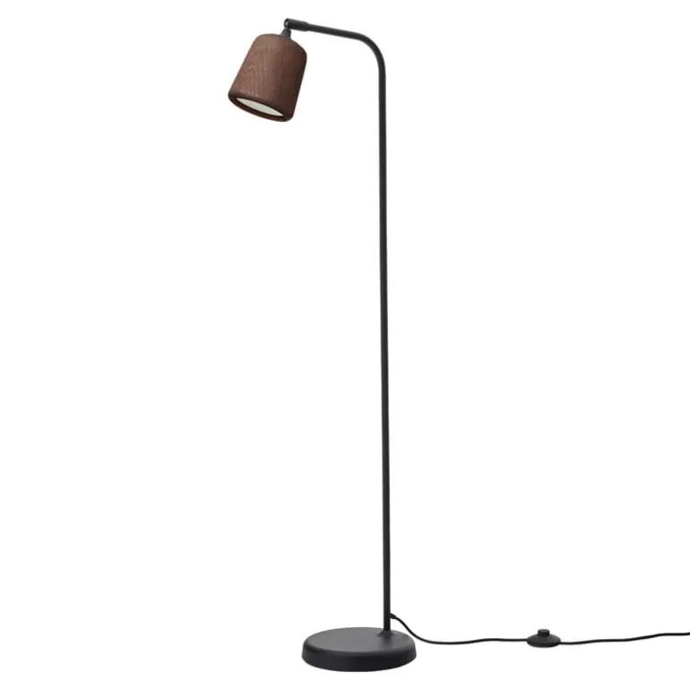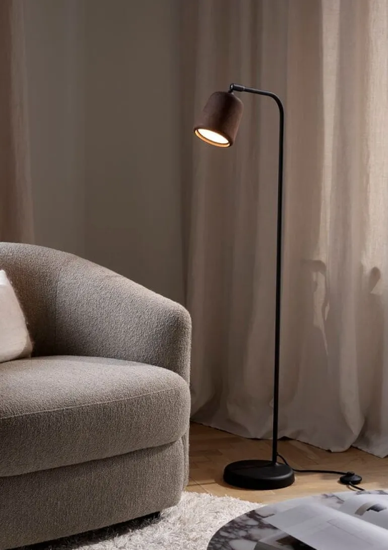 Golvlampan Material från New Works, som namnet antyder, leker med olika material. Ljuskällorna i Material-familjen delar alla samma form, men materialen varierar från trä och metall till glas, marmor, keramik och betong.