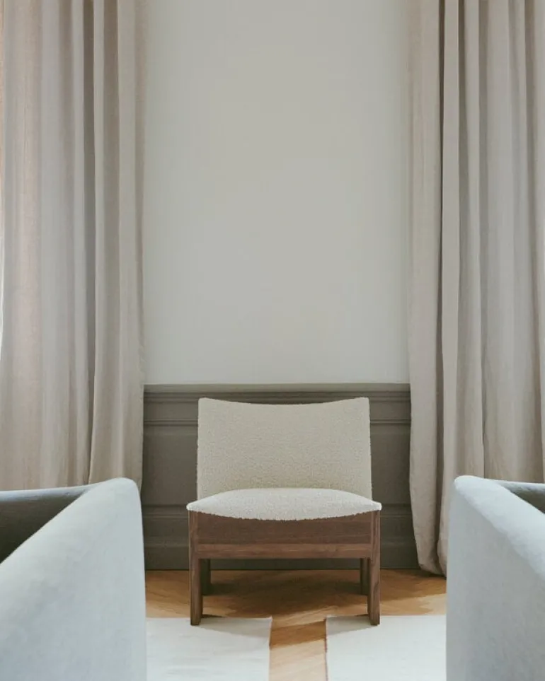 New Works Tenon är en kompakt men visuellt slående fåtölj som blandar mjuka och hårda ytor med en mix av vinklade och runda former. Fåtöljen är tillverkad av massiv ek och har fått sitt namn från de not- och tappförband som utgör stommen. De graciöst böjda trädelarna är klädda med faner, medan sitsen är klädd i tyg och vadderad med mjukt skum för extra komfort. Med sin eleganta, smäckra design passar Tenon fåtölj perfekt som komplement till soffgruppen eller som mysig sittplats i läshörnan. Dessutom är den vackra ryggen en riktig blickfångare mitt i rummet.