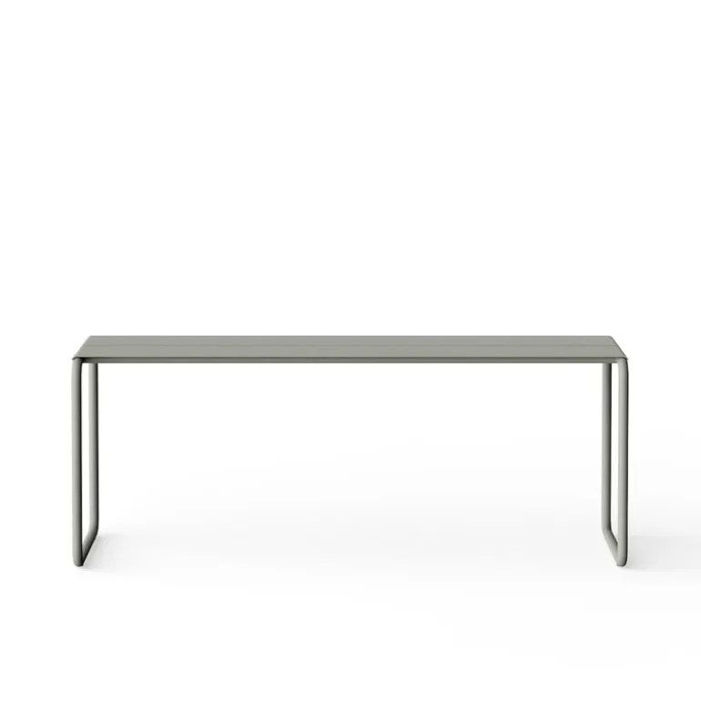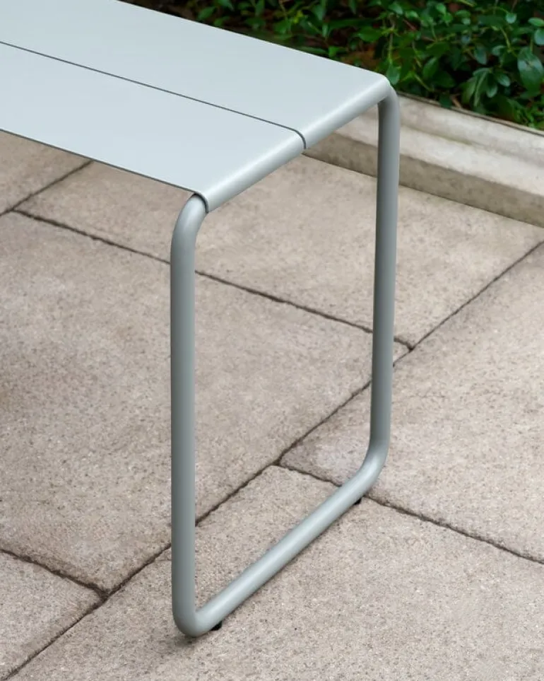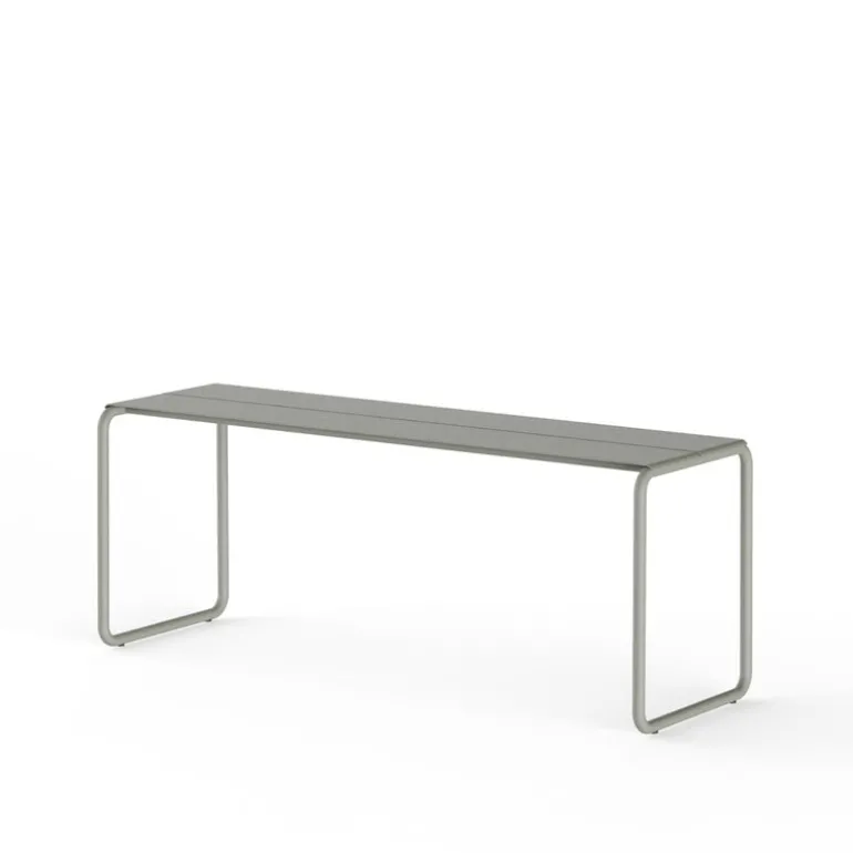 Nines Sine bänk är en elegant trädgårdsbänk i rostfritt stål som sticker ut med sin rörformade, rektangulära ram, vilket ger den ett elegant utseende. Bänkens sits är tillverkad av tunna metallplåtar med springor som gör att den snabbt kan torka efter ett skyfall.