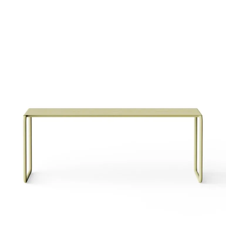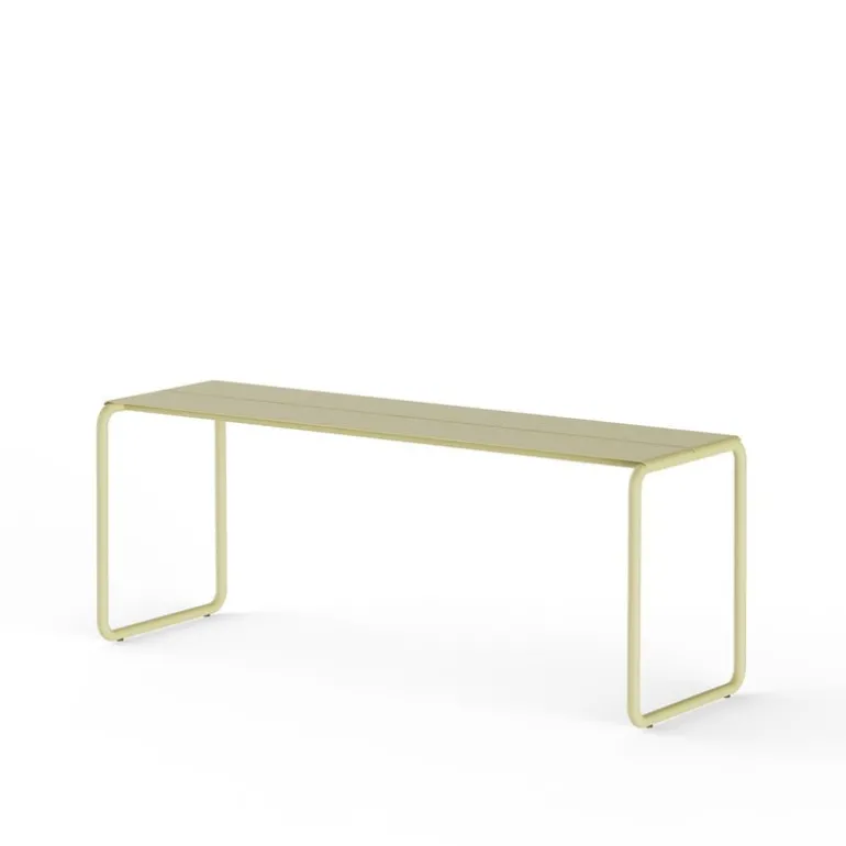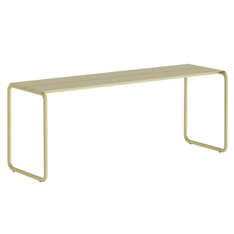 Nines Sine bänk är en elegant trädgårdsbänk i rostfritt stål som sticker ut med sin rörformade, rektangulära ram, vilket ger den ett elegant utseende. Bänkens sits är tillverkad av tunna metallplåtar med springor som gör att den snabbt kan torka efter ett skyfall.