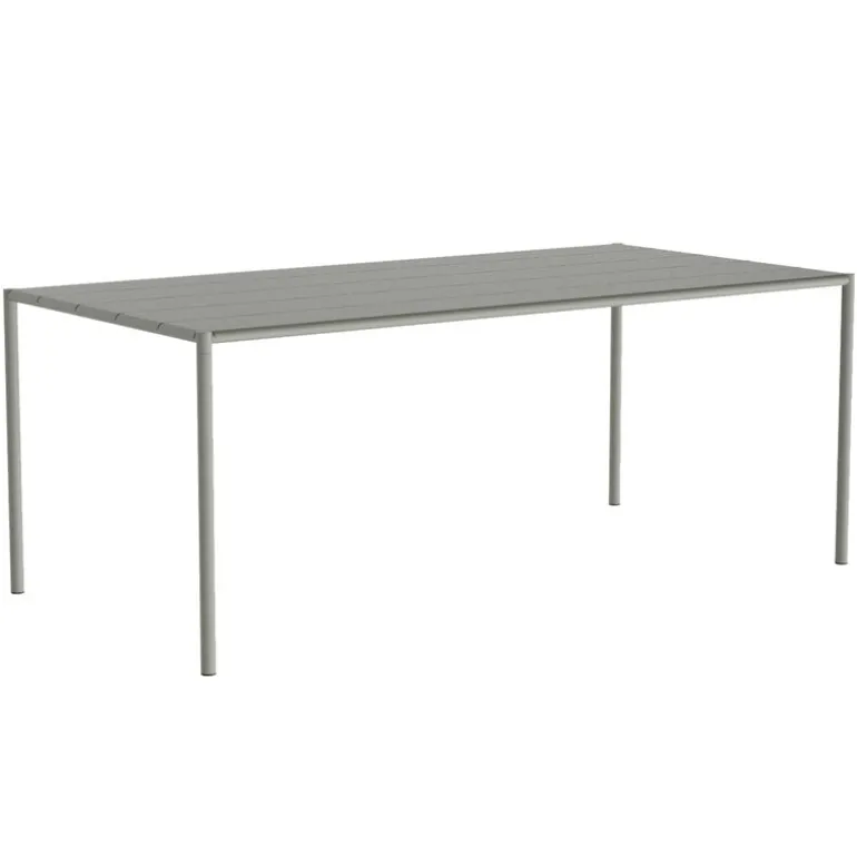 Nines Sine matbord är ett elegant uteplatsbord i rostfritt stål som sticker ut med sina rörformade ben, vilket ger det ett elegant utseende och en robust struktur. Den stora, rektangulära bordsskivan är tillverkad av tunna metallplåtar med springor som möjliggör snabb torkning efter ett skyfall.