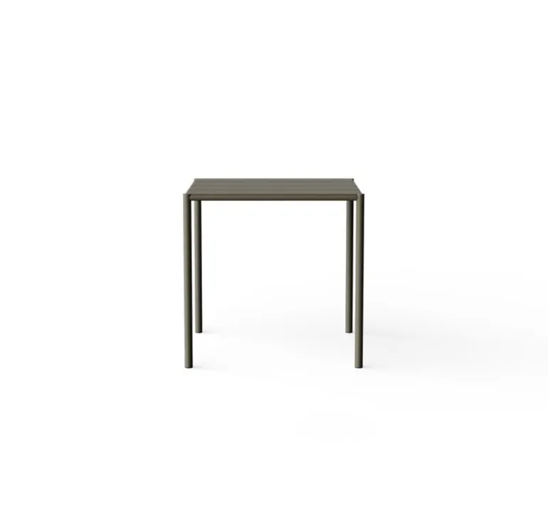 Nines Sine matbord är ett elegant uteplatsbord i rostfritt stål som sticker ut med sina rörformade ben, vilket ger det ett elegant utseende och en robust struktur. Den lilla, kvadratiska bordsskivan är tillverkad av tunna metallplåtar med springor som gör att den snabbt kan torka efter ett skyfall.
