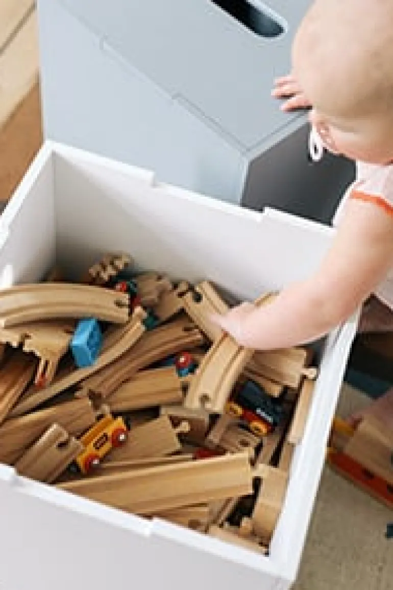 Nofreds Cube förvaringslåda hjälper till att hålla leksakerna organiserade och barnrummet snyggt och prydligt. I linje med Nofreds ideologi om att låta de små vara en del av familjens vardagsliv, har förvaringslådan en minimalistisk design som gör den till den perfekta förvaringsplatsen för leksaker och andra barnartiklar även på andra ställen i hemmet. I hallen eller vardagsrummet, till exempel, fungerar Cube också som ett litet sidobord. Cube förvaringslåda är tillräckligt robust för att till och med kunna sitta på – det är verkligen det ultimata multifunktionella möblet för barnens förvaring!