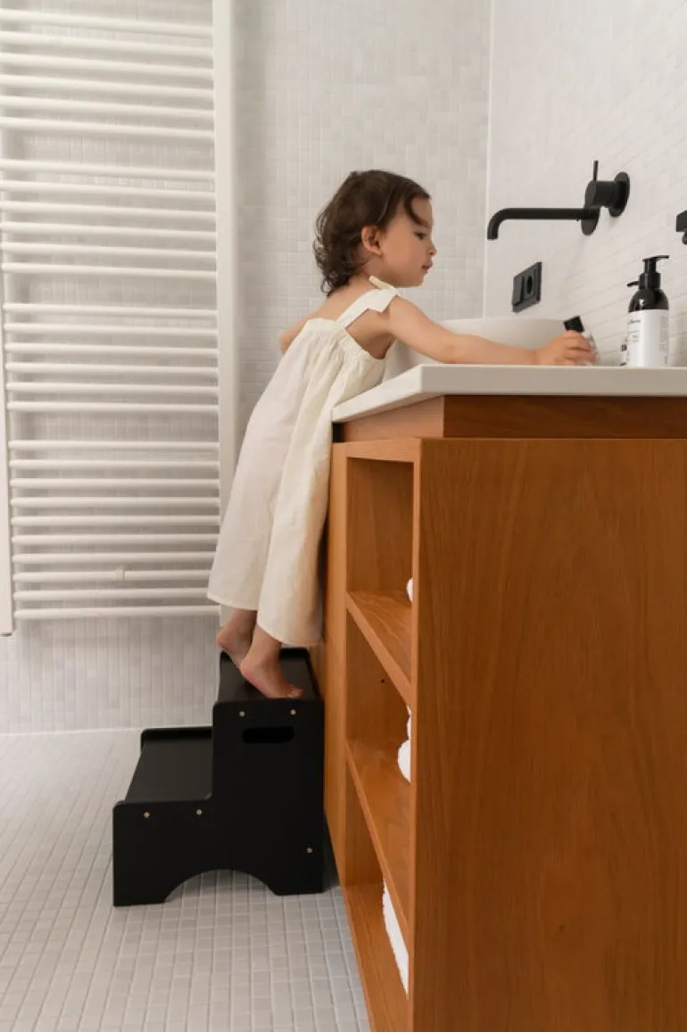 Nofreds Step Up-stege är en praktisk hjälpreda för hushållets yngsta medlemmar – till lekar och andra aktiviteter och för att uppnå sina drömmar. Pallstegen i trä är en trygg och säker följeslagare som barnen kan använda till sina vardagsaktiviteter – och eftersom den är lätt kan den enkelt flyttas från rum till rum. Den tjusiga och minimalistiska stegen låter barnet komma upp lite högre i badrummet, köket eller sovrummet, och uppmuntrar barnet att delta i praktiska sammanhang.