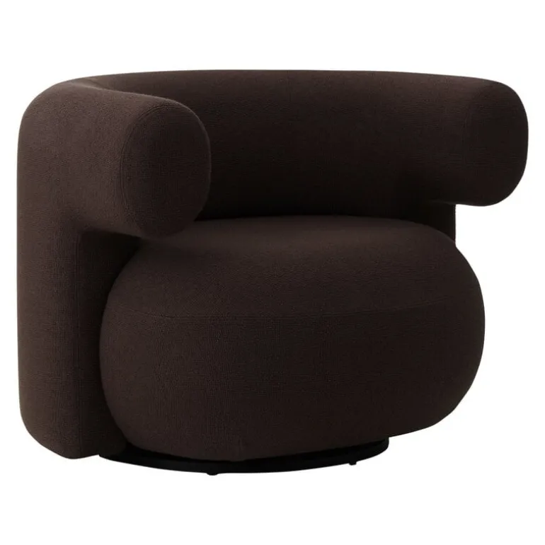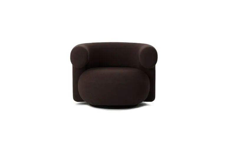 Normann Copenhagens Burra-fåtölj ger en härlig rundhet och omslutande komfort till alla utrymmen där avkoppling är viktigt. Denna skulpturala fåtölj kombinerar en rund sits och böjda armstöd, som vaggar den som sitter i en mild omfamning. Den här Burra-stolen, klädd i ett ulltyg, kommer med en snurrfunktion som snurrar tillbaka – vilket gör det enkelt att vrida sig mot en samtalspartner eller en fin utsikt.