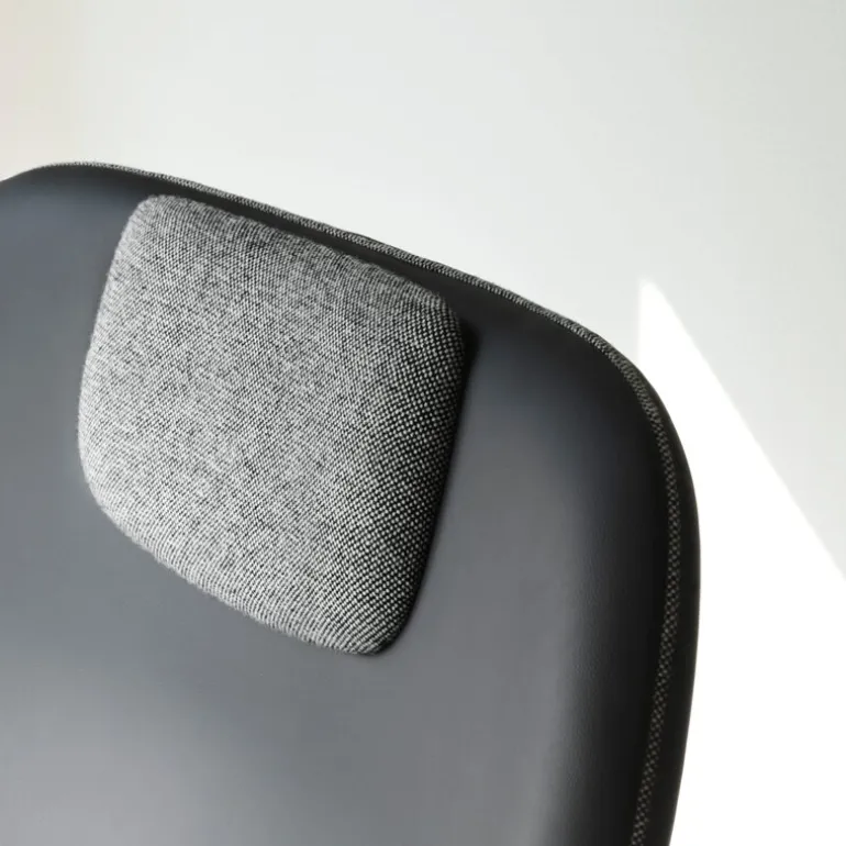 Drape-kollektionen kan i hög grad anpassas, från rammaterial till klädsel och tillbehör. På den höga, läderklädda stolsryggen med metallram sitter ett nackstöd i kontrasterande färg som matchar materialet i sitsen och passpoalerna.