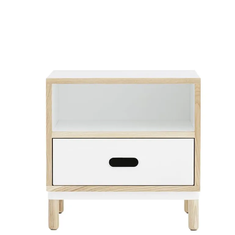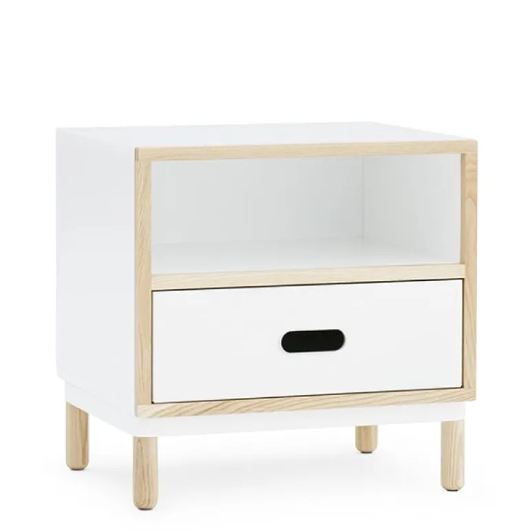 Nattygsbordet Kabino från Normann Copenhagen består av en snygg metallåda och en liten, öppen hylla. Kabinos förvaringsmöbler är designade av Simon Legald och kännetecknas av en urban, industriell look som mjukas upp av de ljusa trädetaljerna. Tack vare det stilrena, enkla utseendet kan möblerna i Kabino-kollektionen användas på kontoret, i köket och i hallen. Det går även att stapla Kabino-möblerna på varandra om man tar bort benen.