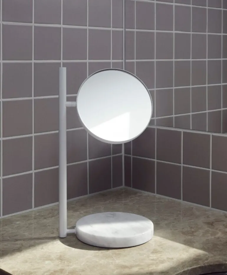 Normann Copenhagens spegel Pose är ett elegant och mycket funktionellt komplement till exempelvis badrummet eller klädkammaren. Bordsspegeln, som formgivits av Simon Legald, står på en rund fot av marmor, vilket skapar balans åt produkten både vad gäller struktur och framtoning. Foten kan även användas som ett stilrent podium till små smycken och prydnadsföremål. På den andra sidan av Pose-spegeln förstoras spegelbilden, vilket gör det lättare att raka sig, sminka sig – och öva in nya poser.