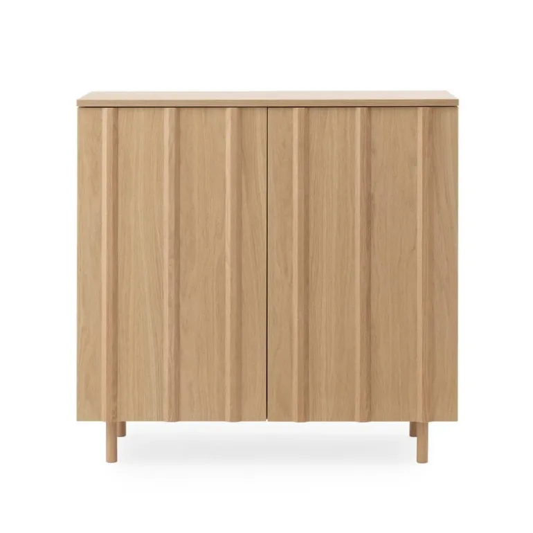Skåpet Rib från Normann Copenhagen har en tidlöst minimalistisk design, inspirerad av arkitekturen hos nordiska sommarstugor. Det ekfanerade skåpet, som formgivits av Simon Legald, är dekorerat med träribbor som påminner om beklädnaden på ett sommerhus, en stuga eller en kesämökki. Tack vare trycklåsen på dörrarna behöver skåpet inte ha några handtag, vilket gör att designens totalintryck blir lika harmoniskt som en härlig och avkopplande sommardag i fritidshuset.