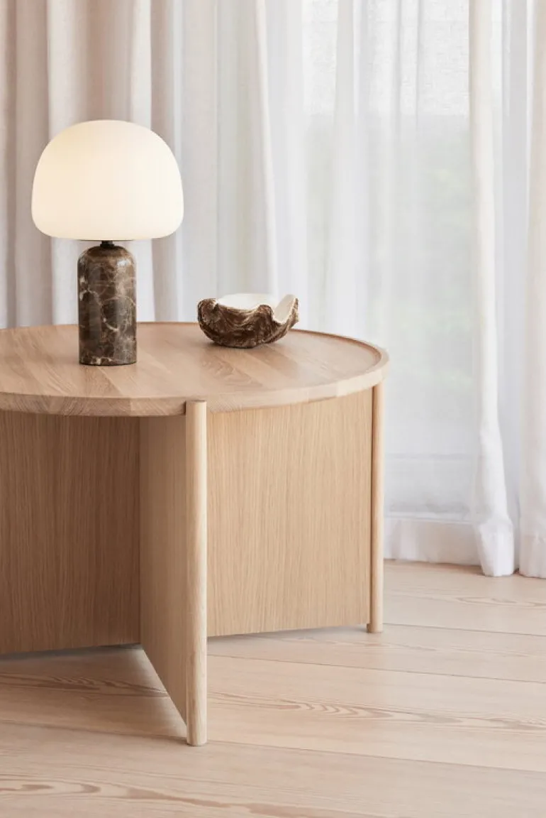 Northern Cling soffbord ger en elegant, modern touch till alla utrymmen. Bordet, som är designat av Anton Björsing, kombinerar en rund bordsskiva med en iögonfallande, geometrisk benstruktur, vilket ger det lätta bordet en överraskande stadighet utan att göra helhetsintrycket för tungt. Den ljusa färgen på ekträet med sitt distinkta ådringsmönster säkerställer denna balans. Cling soffbord är ett tidlöst vackert val för både vardagsrummet hemma och offentliga miljöer.