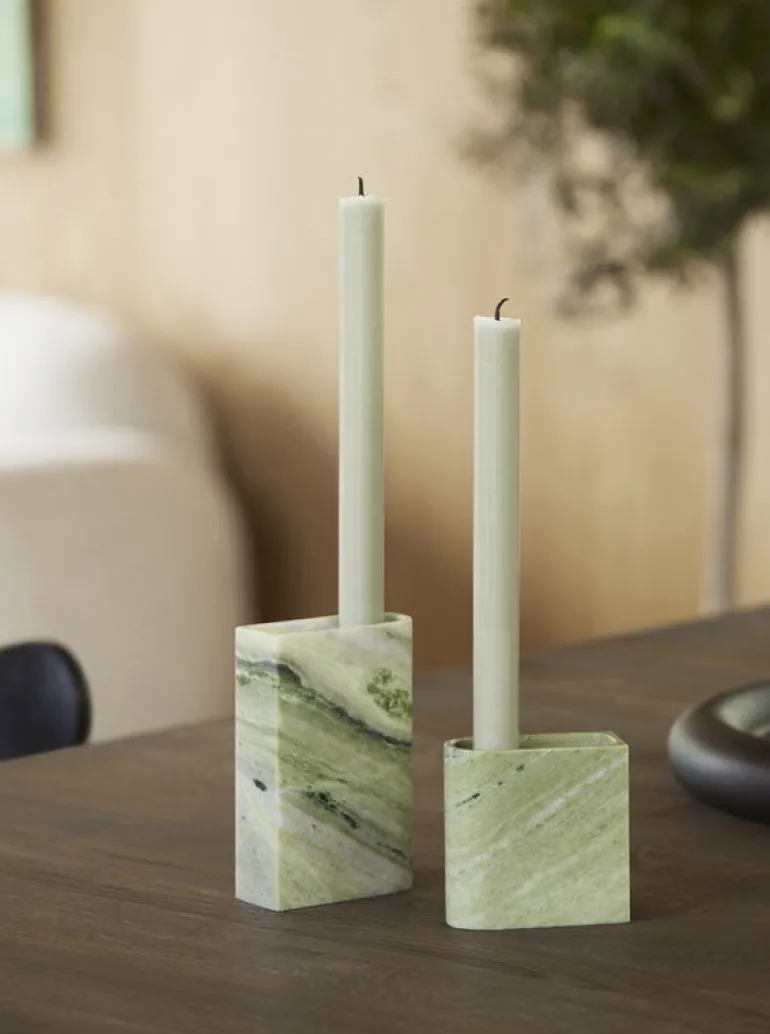 Ljushållaren Monolith från Northern är en elegant ljusstake, tillverkad av en vacker blandning grön marmor. I toppen av den minimalistiska ljushållaren finns en kant inom vilken ljuset placeras och som samtidigt fångar upp det smälta stearinet. Formgivarduon Morten & Jonas fick inspiration till den skulpterade ljusstakens form från stenbrott och de spår de lämnar efter sig i landskapet.