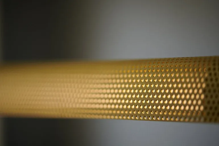 Radent pendellampa, från NUAD, är gjord av perforerat stål och aluminium. Den enkla armaturen ger ett direkt ljus nedåt, men tack vare dess konstruktion filtreras ljuset även uppåt, genom det böjda metallnätet. Radents enkla men självklara uttryck passar utmärkt på det moderna kontoret, i privata hem ovanför matbordet eller över köksön. Den industriella lampan är också enkel att se framför sig i hotell, restauranger eller barer.