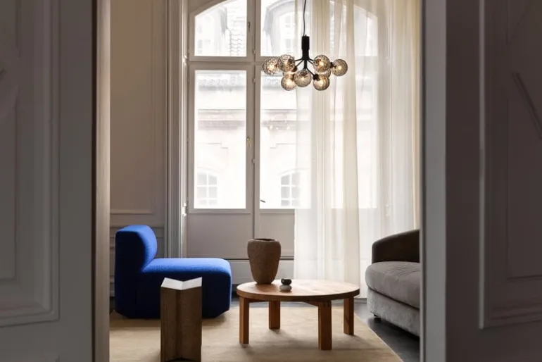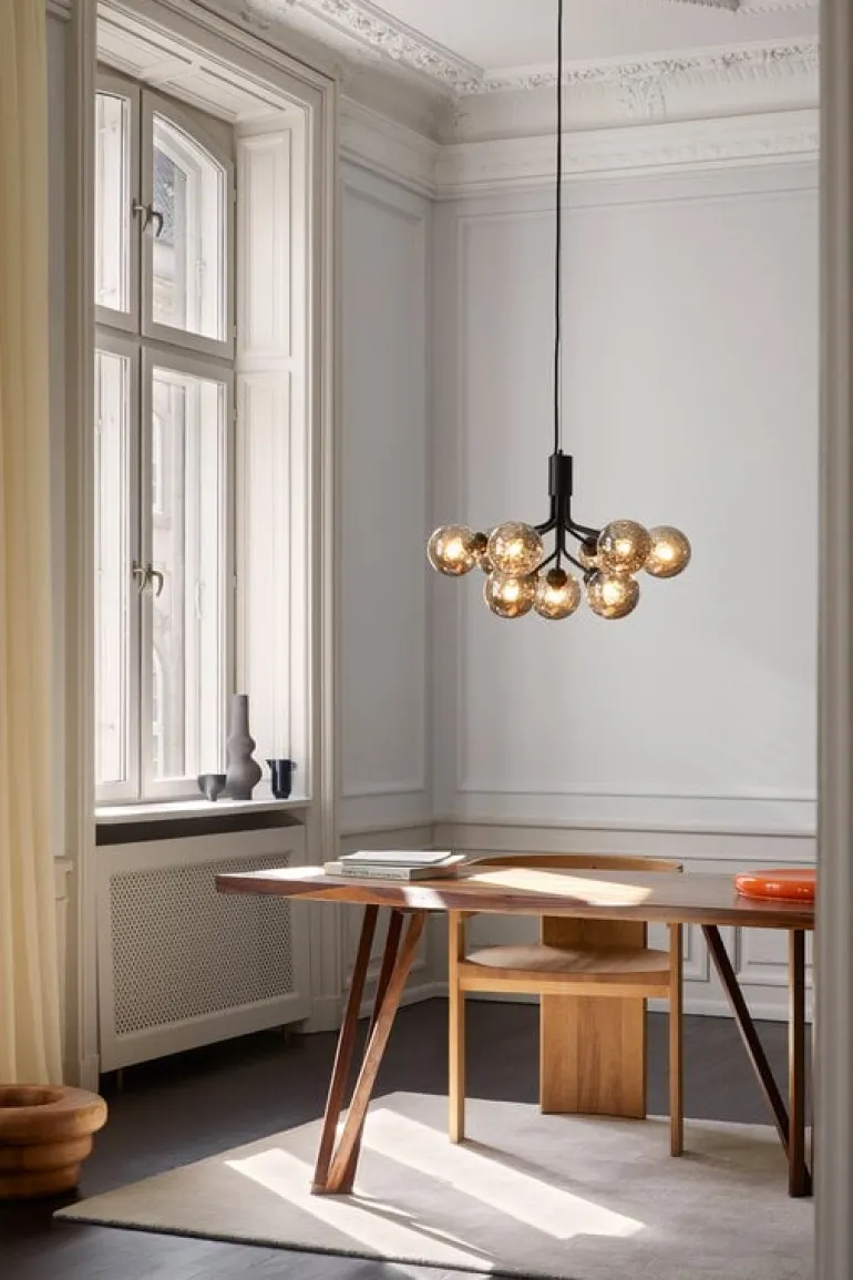 Pendellampan Apiales 9 är designad av Sofie Refer för danska Nuura och är en bedårande, modern ljuskrona som är inspirerad av blomklasar. Pendellampans stora, men slanka metallram har nio stycken runda, munblåsta glaskupor vars optiska textur skapar ett fint, glödande mönster i en vacker nyans.