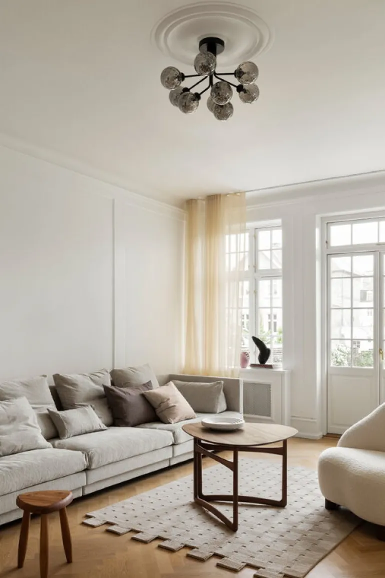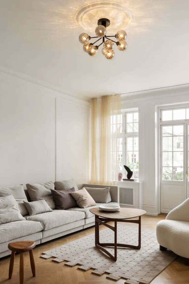 Taklampan Apiales 9 drar blickarna till sig i till exempel hallen, över matbordet eller som mittpunkt i vardagsrummet – dess måttliga höjd gör armaturen perfekt för utrymmen med lågt i tak där en lågt hängande ljuskrona inte skulle passa.