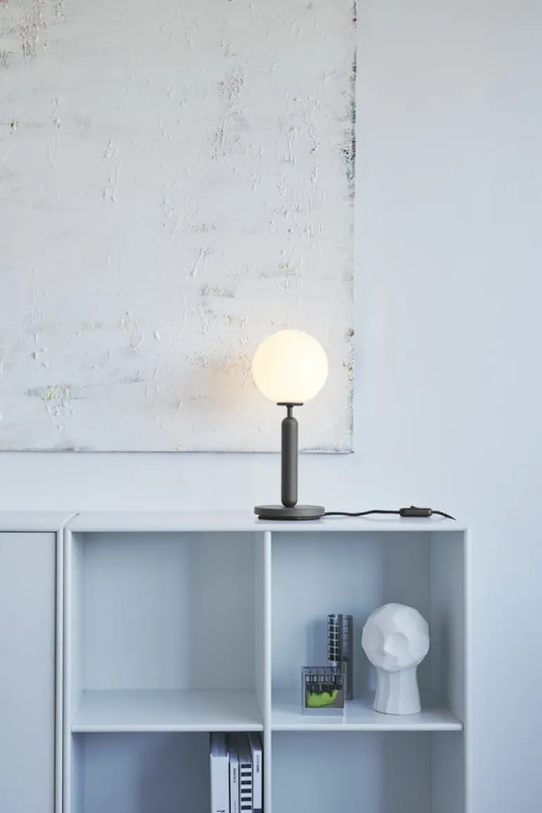 Bordslampan Miira från det danska designmärket Nuura drar blickarna till sig med sin vackert formade glaskupa, som kastar ett stämningsfullt sken över väggen.