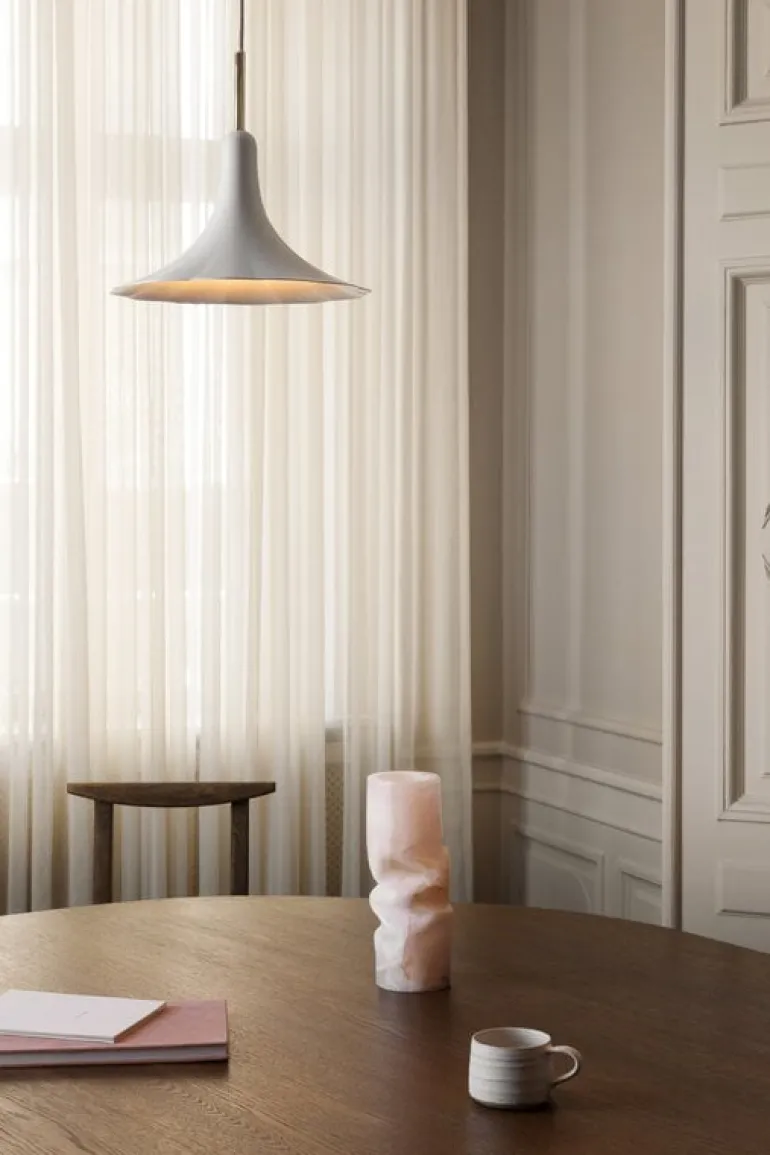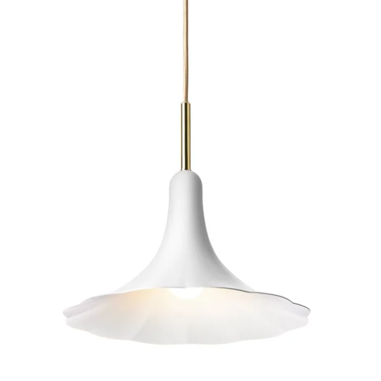 Nuuras Petalii 1 pendellampa är en modern upphängningslampa som utstrålar romantisk charm med sin klockformade skärm. Den fängslande armaturen kastar direkt nedåtriktat ljus och består av en vacker vit metallblomma placerad på en mässingsfärgad bas. Den är perfekt att hänga över en soffgrupp eller matbord – lampan kommer till sin rätt i mindre utrymmen och blir ett riktigt statement när den hängs i grupp på större ytor.