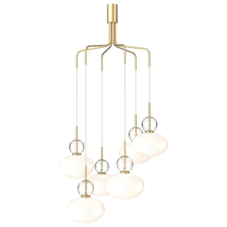 Nuuras pendellampa Rizzatto Cluster 6 är en modern tolkning av en ljuskrona, skapad av den kände italienske formgivaren Paolo Rizzatto. Designen utgörs av mässingsfärgat aluminium, strukturglas i Nuuras typiska stil – kombinerat med två munblåsta kupor i opalvitt glas.
