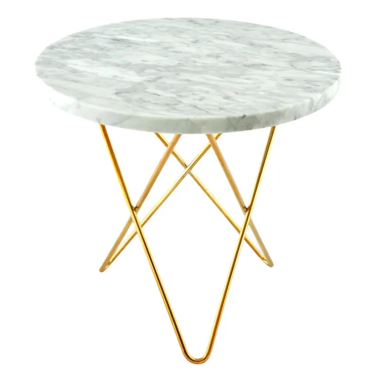 Mini O Table är en mindre variant av bordet O Table från OX Denmarq. Designen är en intressant kombination av två olika material: den mjuka, böjda mässingsramen ger bordet ett lätt utseende, som fulländas av den kraftiga, livfulla bordsskivan i marmor. Utseendet blir ännu mer unikt med tiden, eftersom mässingens glans får en mörkare patina. Dennis Marquart är formgivaren bakom Mini O Table, ett soffbord som passar utmärkt till en mindre soffa eller till en läshörna, eller som extrabord till andra rum i huset.
