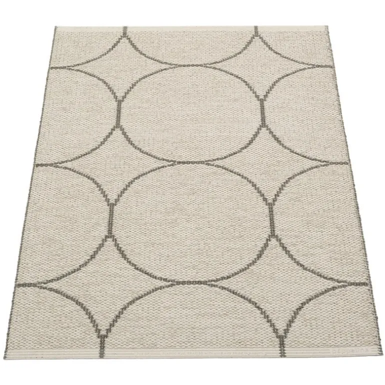 Boo plastmattor från Pappelina är prydda med stora, grafiska cirklar och är vävda på traditionellt sätt i vävstol i Dalarna, Sverige. Mattorna är vändbara och har ett motsvarande mönster på den motsatta sidan. Mattorna är tillverkade av ftalatfria PVC-band, är slitstarka och lättskötta, och de två eleganta färgtonerna går väl ihop med olika inredningar. Mattan kan tack vare sin smala form med lätthet användas som praktfull gångmatta i hallen, som köksmatta eller utomhusmatta. Boo-mattorna har svetsade kanter och en präglad Pappelina-logo.