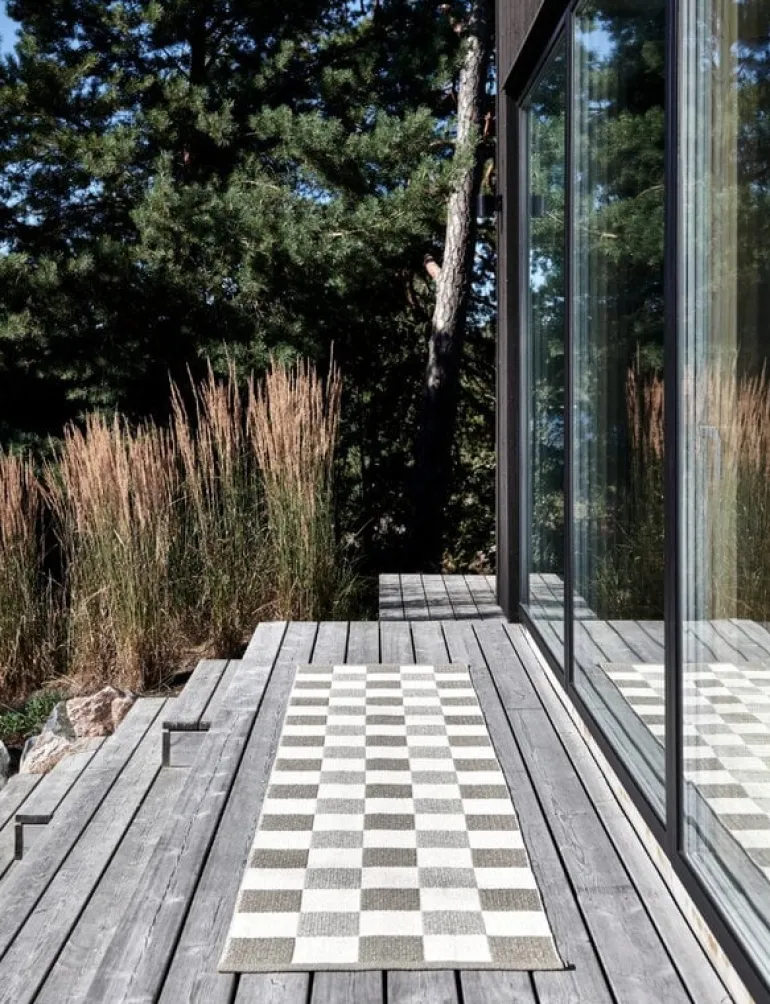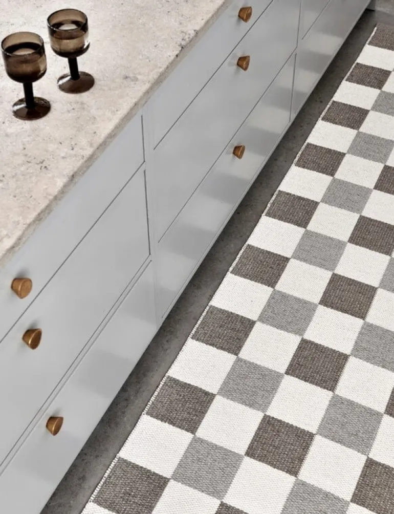 Mattan Pix från Pappelina har ett klassiskt rutmönster vävt i tre olika färger. De dubbelvikta kanterna är fållade med en stark söm, och i det ena hörnet finns en gummietikett med Pappelina-logon insydd. Pix-mattan kan tvättas för hand eller i maskin.