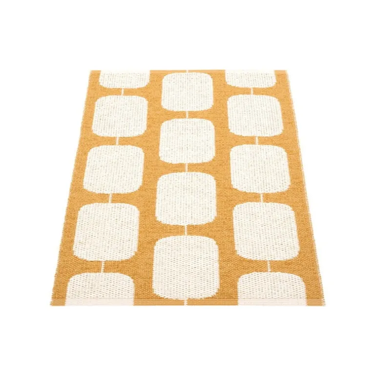 Pappelinas matta Sten har ett vackert geometriskt mönster som påminner om gatstenar. En dubbelsidig design innebär dubbel glädje: du kan vända på mattan när du känner att det är dags för en ny färg. De dubbelvikta kanterna är fållade med en stark söm.