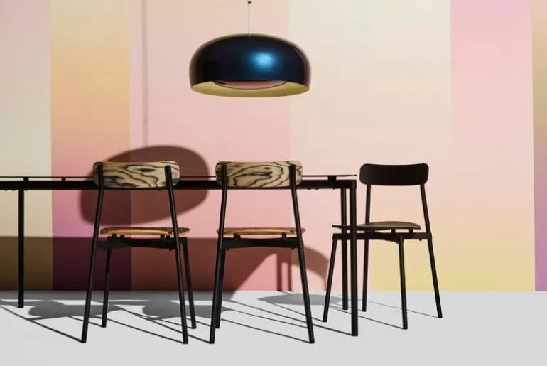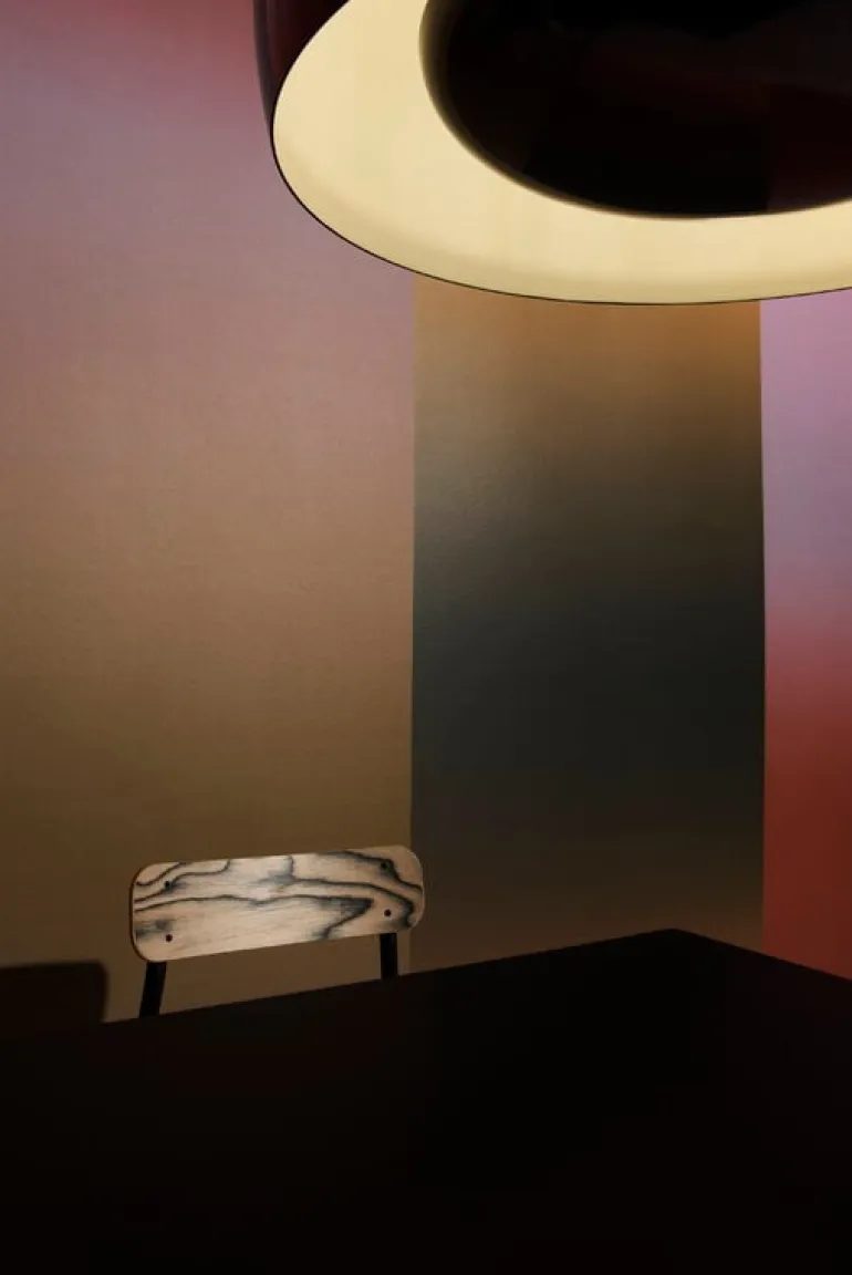 Pendellampan Brushs livfulla färgton frambringas med hjälp av en speciell härdningsteknik, som får färgpigmenten att reagera och ge aluminiumskärmen en metallisk glans. Lampans ljuskälla har placerats bakom en avbländande skärm som riktar ljuset mot den vita insidan, vilket gör att ljusskenet får en mjuk, neutral ton.