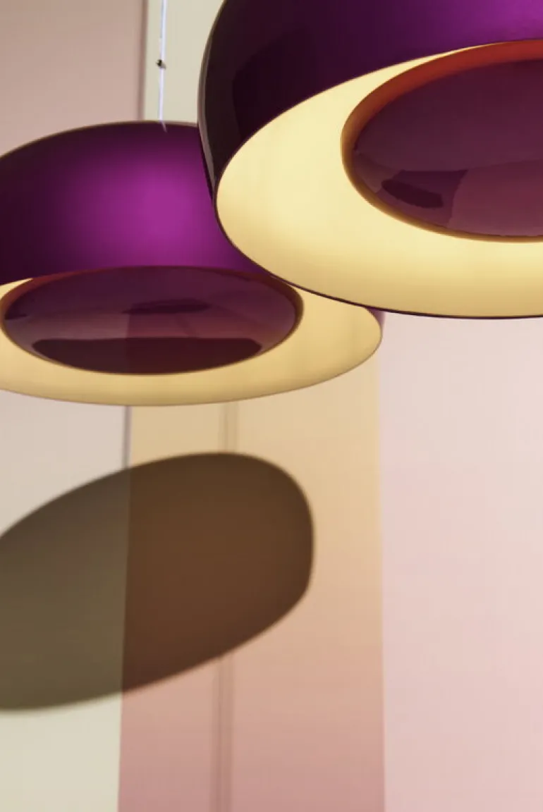 Pendellampan Brushs livfulla färgton frambringas med hjälp av en speciell härdningsteknik, som får färgpigmenten att reagera och ge aluminiumskärmen en metallisk glans. Lampans ljuskälla har placerats bakom en avbländande skärm som riktar ljuset mot den vita insidan, vilket gör att ljusskenet får en mjuk, neutral ton.