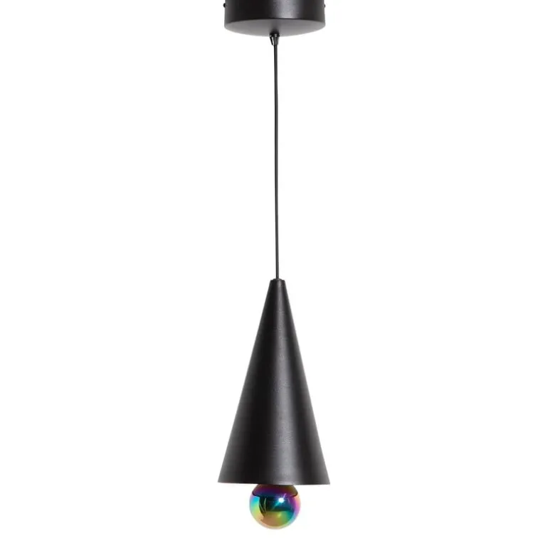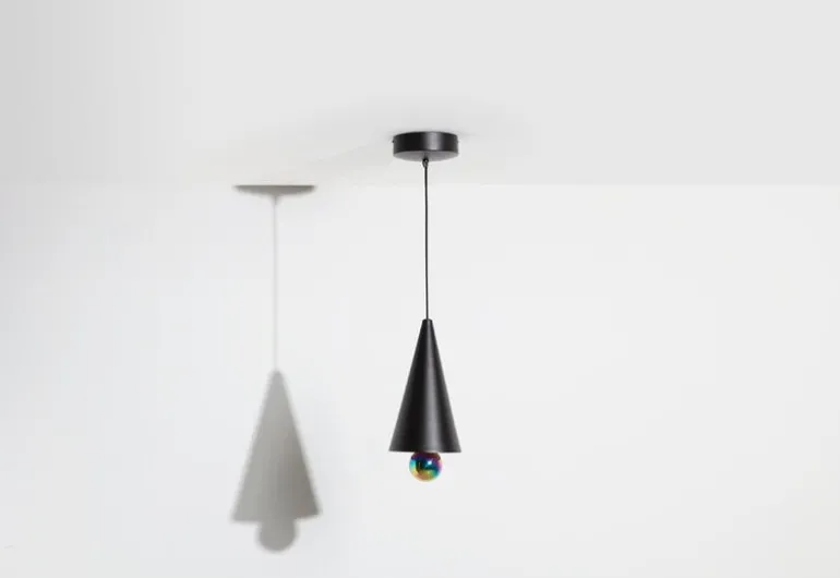 Petite Fritures Cherry pendellampa har en rolig design som kommer att glädja alla som gillar geometri och minimalism. Lampan består av en enkel metallkon och en glittrande regnbågsfärgad sfär fäst vid basen i plexiglas. Enligt formgivarna Daniel To och Emma Aiston från Daniel Emma är lampans form en referens till suddgummin som de brukade samla som barn – närmare bestämt en glasskål toppad med ett körsbär. Cherry är en modern pendellampa som är iögonfallande och sprider ett mjukt och behagligt ljus.