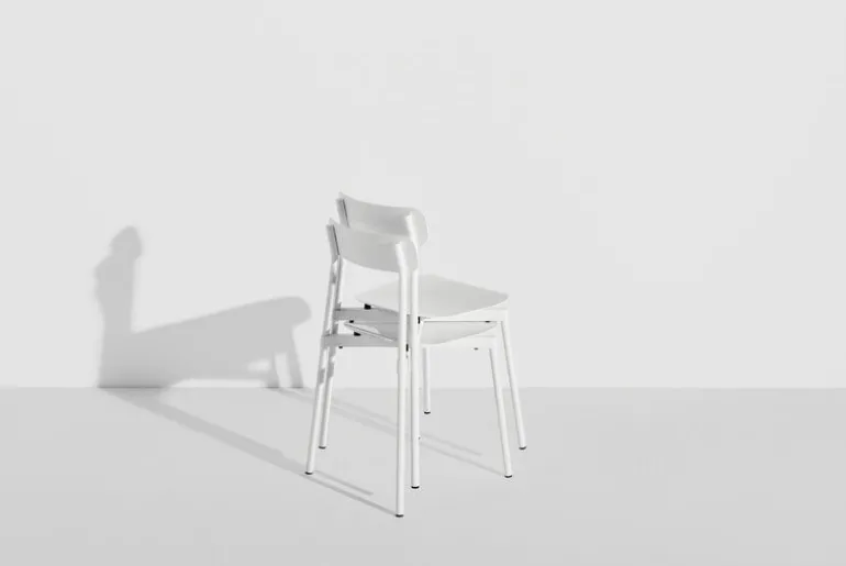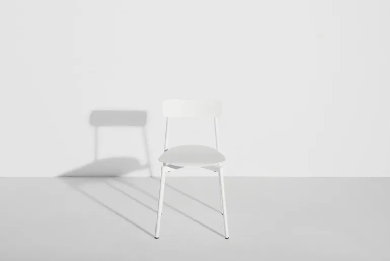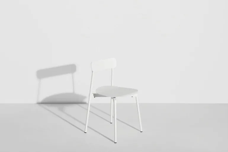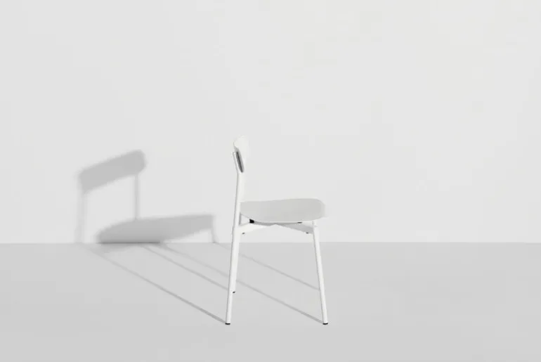 Stolen Fromme från Petite Friture har enkla, strömlinjeformade former och en lätt välvd sits med inbyggda stötdämpare för att ge en maximalt mjuk och följsam upplevelse. Stolen är tillverkad av mattlackerat aluminium och är avsedd att användas både ute och inne – Fromme passar alltså lika bra som utomhusstol i trädgården som matstol inomhus.