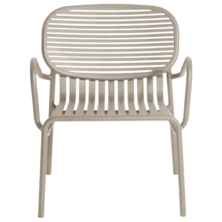 Week-end fåtöljen ingår i Petite Fritures kollektion med utemöbler i aluminium. Week-end fåtöljen kännetecknas av ovala former med både horisontella och vertikala lameller på ryggstödet. Alla stolarna i serien Week-end är stapelbara.