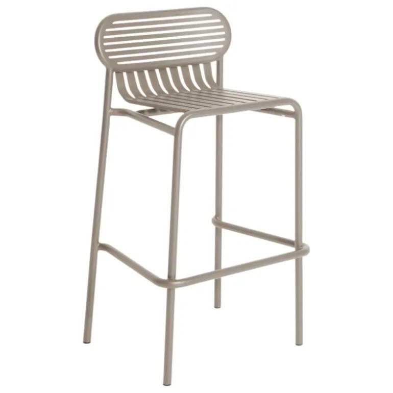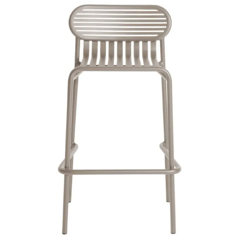 Den höga pallen Week-end ingår i Petite Fritures kollektion med utemöbler i aluminium. Den höga Week-end pallen kännetecknas av ovala former med både horisontella och vertikala lameller på ryggstödet. Barstolen är vacker ihop med det höga bordet från Week-end kollektionen.