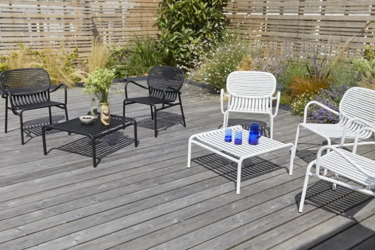 Designduon bakom Petite Fritures utemöbler Week-end heter BrichetZiegler, i kollektionen kombinerar de olika geometriska former med samtida, funktionell design. Aluminiumkonstruktionen gör möblerna lätta och slitstarka på samma gång. Den matta, epoxybehandlade ytan klarar av alla väderförhållanden. Kollektionen Week-end består av stolar, bänkar och bord i många färger och storlekar. Utomhusmöblerna fungerar lika bra i stora trädgårdar som på små balkonger. Tack vare den eleganta designen kan serien även användas inomhus.