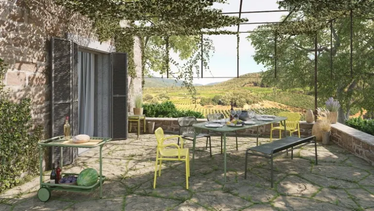 Designduon bakom Petite Fritures utemöbler Week-end heter BrichetZiegler, i kollektionen kombinerar de olika geometriska former med samtida, funktionell design. Aluminiumkonstruktionen gör möblerna lätta och slitstarka på samma gång. Den matta, epoxybehandlade ytan klarar av alla väderförhållanden. Kollektionen Week-end består av stolar, bänkar och bord i många färger och storlekar. Utomhusmöblerna fungerar lika bra i stora trädgårdar som på små balkonger. Tack vare den eleganta designen kan serien även användas inomhus.