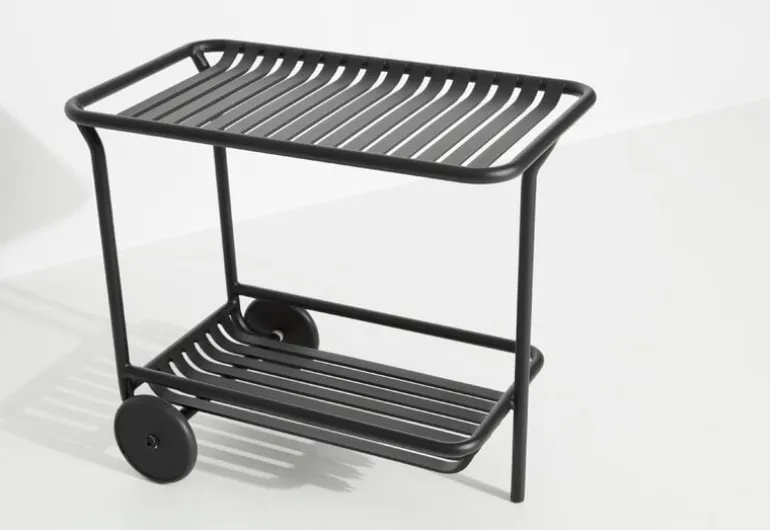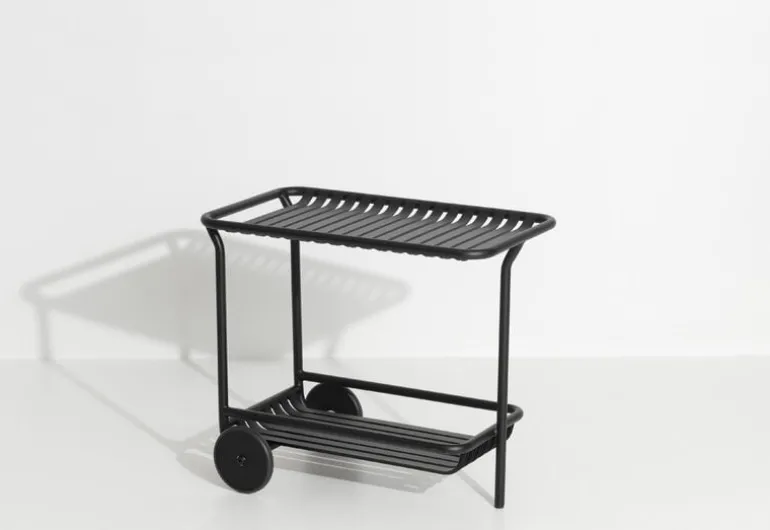 Vagnen Week-end ingår i Petite Fritures kollektion med utemöbler i aluminium. Den stilrena, långa serveringsvagnen för utomhusbruk bjuder in till livfulla och sofistikerade cocktailstunder i trädgården, på terrassen eller balkongen. Vagnens multifunktionella karaktär gör att den även fungerar utmärkt som sidobord eller soffbord.