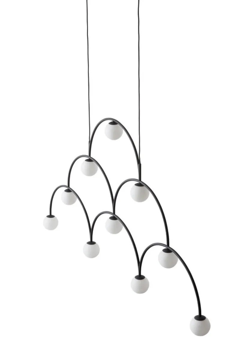 Bounce 169 pendellampan, som skapades av Monika Mulder för Pholc, är en omgivande ljuskälla såväl som en hängande skulptur i ett. Lampans svartmålade metallbågar och glober i opalglas skapar ett delikat och energiskt uttryck på samma gång som fångar blickar oavsett rummet den placeras i, må det vara i hem eller allmänna utrymmen. Den platta skärmliknande Bounce 169 är idealisk för alla utrymmen där det behövs ett mjukt diffust ljus och en definierad fokalpunkt.