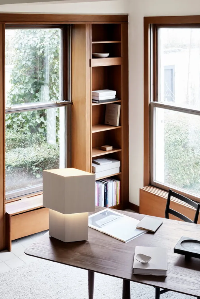 Inom geometrin kallas Rombens kvadratiska form för romb, där alla fyra sidor har samma mått. Den ovanliga formen ger Romb ett slående utseende samtidigt som den är en praktisk lösning. Formen gör armaturen elegantare så att den även passar på en smalare hylla eller fönsterbräde. Lampan har ett indirekt ljus från den öppna ovansidan och under lampskärmen, som även framhåller lampans fascinerande geometri. Den robusta formen och den fina texturen skapar också en kontrast som gör bordslampan Romb nästan till en skulptur. Romb ger garanterat en betagande touch till inredningen även när ljuset är släckt.
