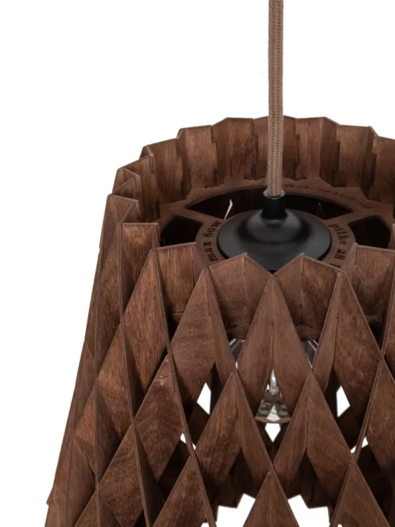 Pilke 28 ingår i den enkla men samtidigt dekorativa serien Pilke Signature Collection, formgiven av Tuukka Halonen. Pilke-lamporna är gjorda av björkplywood och är en underbar förening av teknik och tradition: Halonen hämtade inspiration till designen från finskt traditionellt trähantverk, men har sedan tagit hjälp av moderna tillverkningsmetoder och material. Lamporna, en modern tappning av spontverk, kännetecknas av sina kristalliknande mönster som filtrerar ljuset på ett behagligt sätt och kastar vackra skuggor på väggarna och i taken. Alla Pilke-lampor formges och tillverkas för hand i Finland.