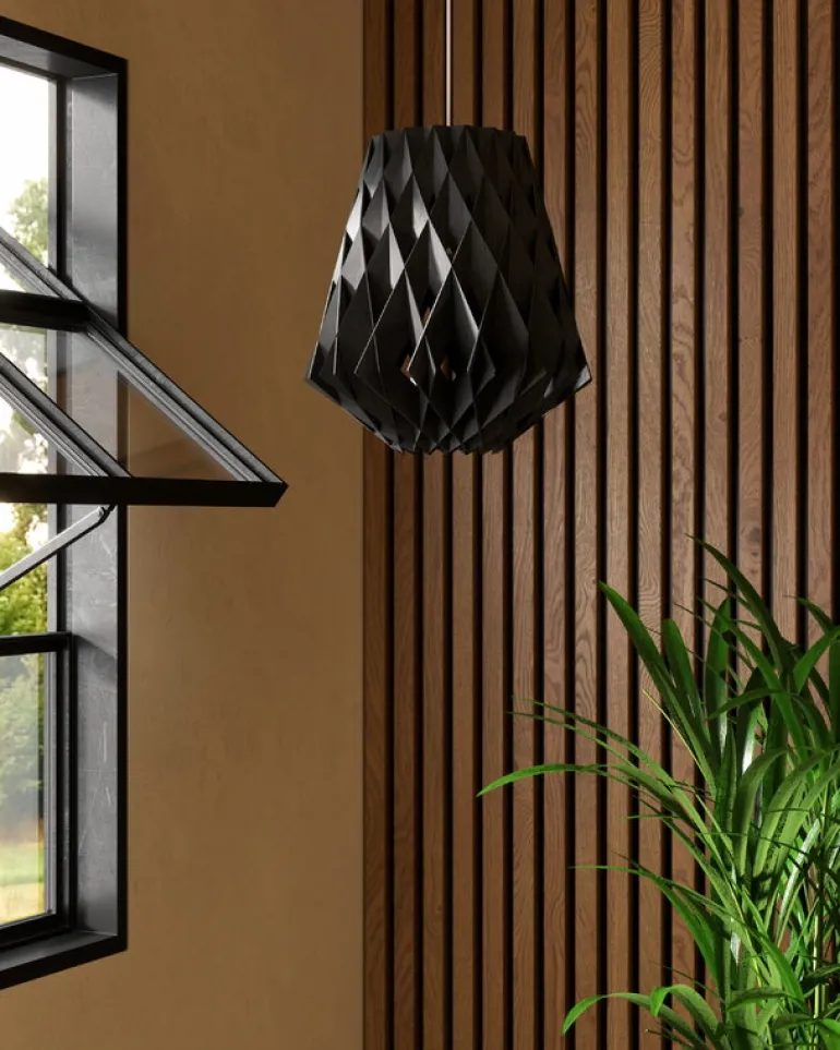 Pilke 28 är en del av den enkla men ändå dekorativa Pilke Signature Collection, designad av Tuukka Halonen. Tillverkad av björkplywood, är Pilke-lamporna en förtrollande kombination av teknologi och tradition: Halonen sökte influenser för designen från traditionellt finskt träarbete men använde dagens tillverkningsmetoder och material. Som en modern tolkning av spåntak, kännetecknas lamporna av ett kristalliknande mönster som filtrerar ljuset behagligt och kastar vackra skuggor på väggarna och taket. Alla Pilke-lampor är designade och handgjorda i Finland.