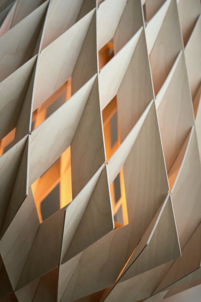 Pilke 64 ingår i den enkla men samtidigt dekorativa serien Pilke Signature Collection, formgiven av Tuukka Halonen. Pilke-lamporna är gjorda av björkplywood och är en underbar förening av teknik och tradition: Halonen hämtade inspiration till designen från finskt traditionellt trähantverk, men har sedan tagit hjälp av moderna tillverkningsmetoder och material. Lamporna, en modern tappning av spontverk, kännetecknas av sina kristalliknande mönster som filtrerar ljuset på ett behagligt sätt och kastar vackra skuggor på väggarna och i taken. Alla Pilke-trälampor formges och tillverkas för hand i Finland.