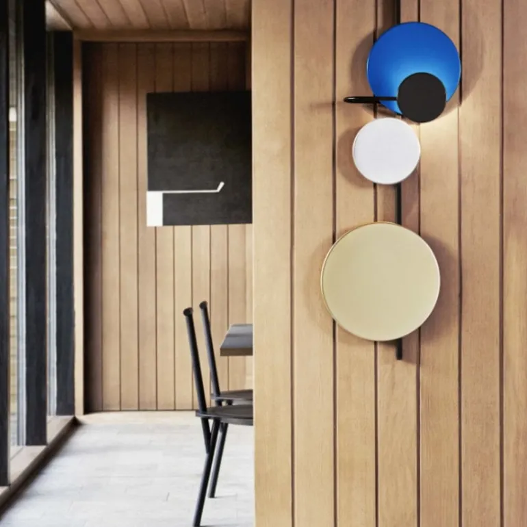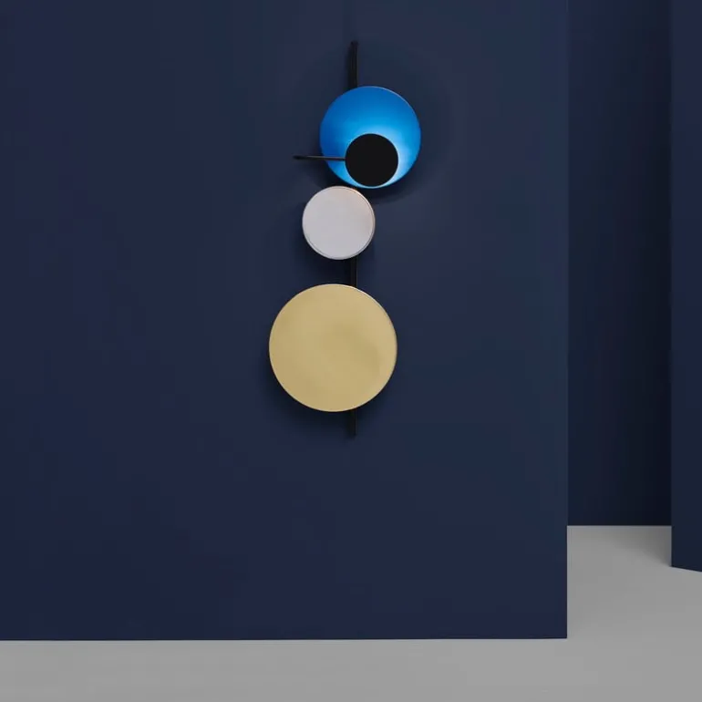 Lampan Planet, formgiven av Mette Schelde för PLEASE WAIT to be SEATED, har en fascinerande design med växelverkande effekter. Vägglampan består av en smal ram och tre skivor i olika storlekar som påminner om planeter. Skivorna, som är tillverkade av mässing, aluminium och pulverlackerat stål, reflekterar ljuset och kastar skuggor på sina alldeles egna unika sätt. Lampan Planets utseende kan enkelt ändras, eftersom planeterna är fästa vid ramen med magneter. Med den stämningsfulla lampan Planet kan du skapa egna privata solsystem med omloppsbanor och förmörkelser.
