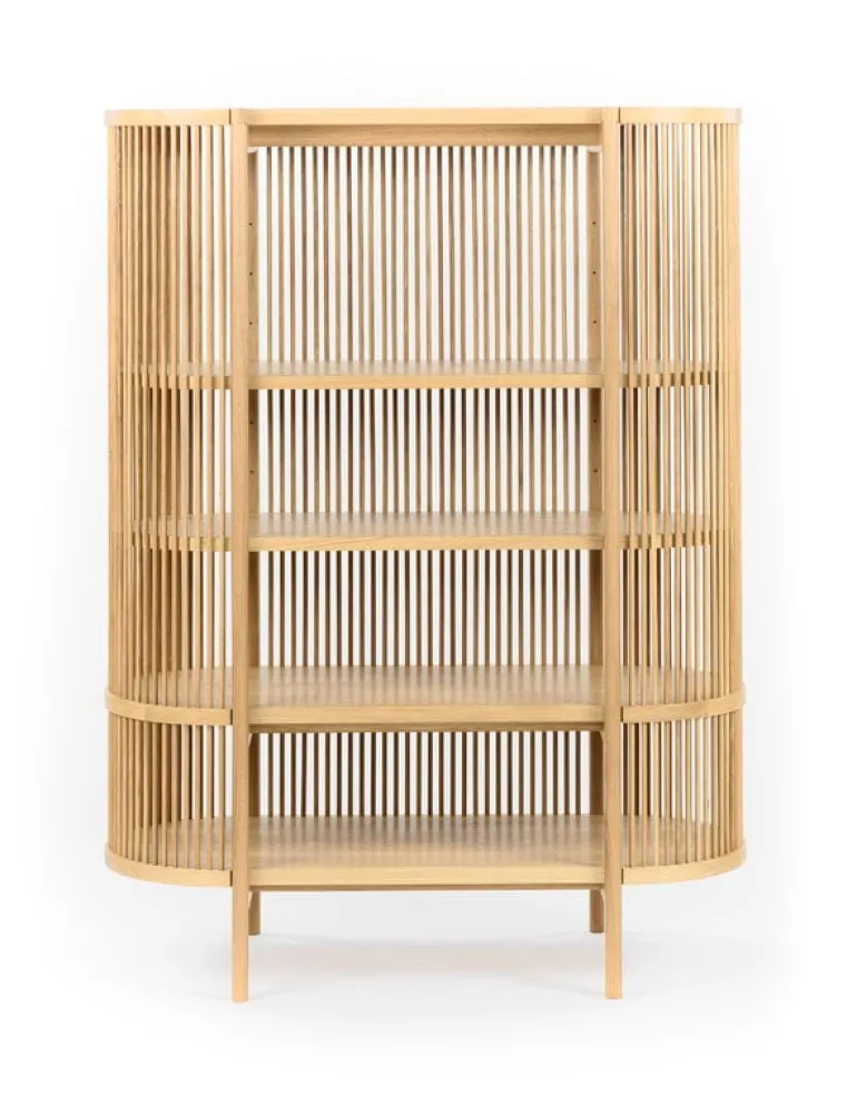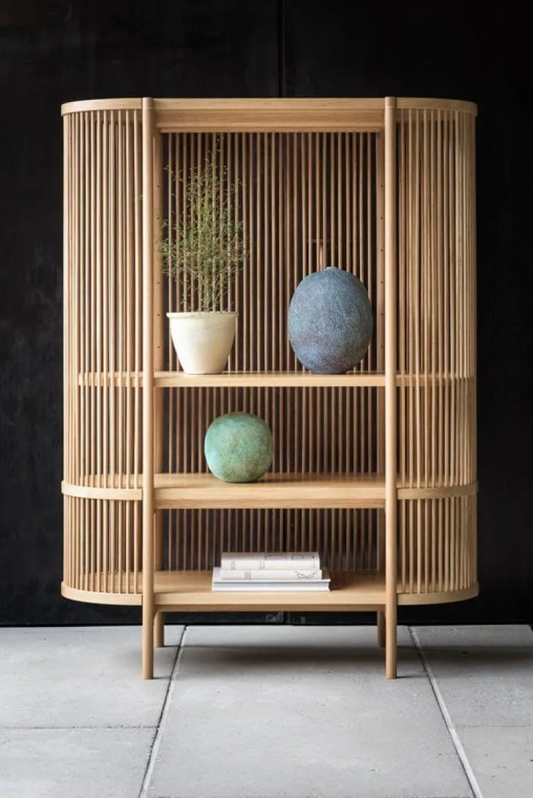 Bastone skåp är ett tidlöst och skulpturalt konstverk som formgivits av trädesignern Antrei Hartikainen för finska Poiat. Sidorna i skåpet av massivt trä är gjorda i trälameller, de filtrerar ljuset in i möbeln och gör att den kastar vackra skuggor omkring sig. De tjocka hyllorna och den massiva överdelen ger en stabil struktur. De utgör också en vacker kontrast till de transparenta sidorna. Bastone är en charmig miljö för dina favoritsaker, oavsett rum. Fyll den med böcker och prydnadsföremål i vardagsrummet eller använd den för att förvara porslin i köket. Tack vare den öppna strukturen, kan du också placera en krukväxt eller en snygg lampa i den.