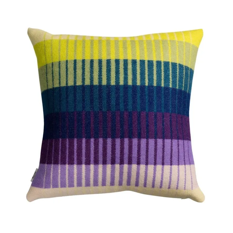 Prydnadskudden Åsmund Gradient, från Røros Tweed och med design av Kristine Five Melvær, kombinerar skarpa geometriska former med lysande, rika färger för en fantastisk visuell effekt. Sortimentet Åsmund Gradient är influerat av textilkonst och gobelänger av ylle, som Melvær har gett en modern touch. Det är enkelt att byta estetisk inriktning med prydnadskudden Åsmund Gradient, som har något olika design på fram- och baksidan.