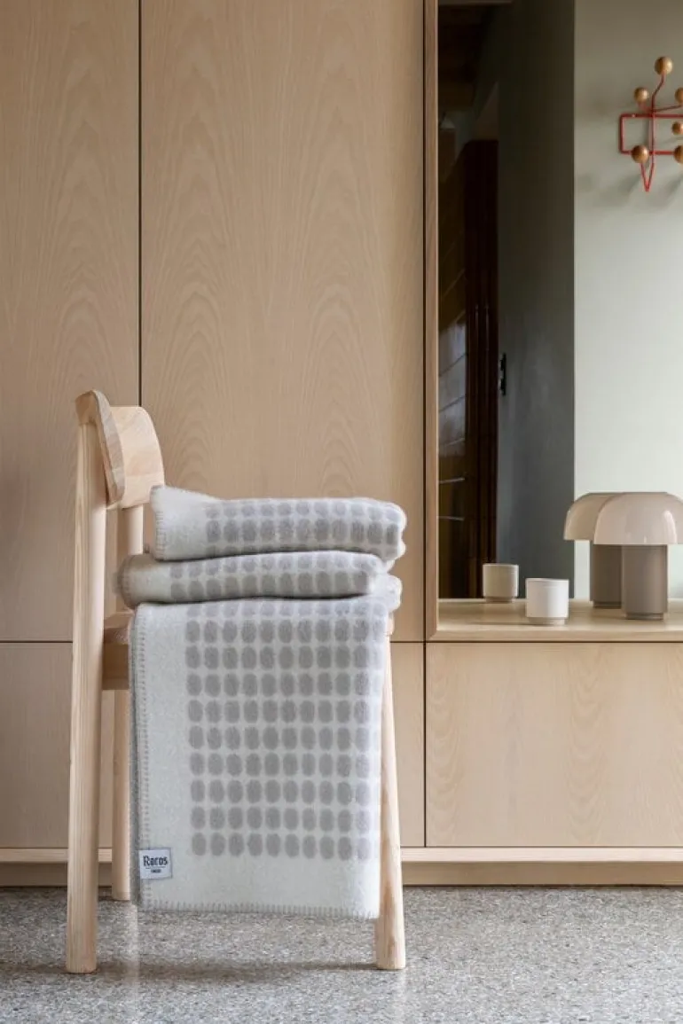 Røros Tweeds filt Palette är prydd med ett grafiskt mönster skapat av Petter Skogstad och Fredrik Wærnes. Designen är inspirerad av klassiska trycktekniker som silkscreen, litografi och träsnitt, vilket tydligt framgår av de strukturellt arrangerade prickarna som finns över hela ytan. Filten är vävd av ull i två distinkta färger. Mönstret finns på båda sidor, men i omvända färger. Filten har dessutom kompletterats med kraftiga kantsömmar. Palette är perfekt för mysig avkoppling i soffan eller sängen, men den fina filten kan även ges bort i present.