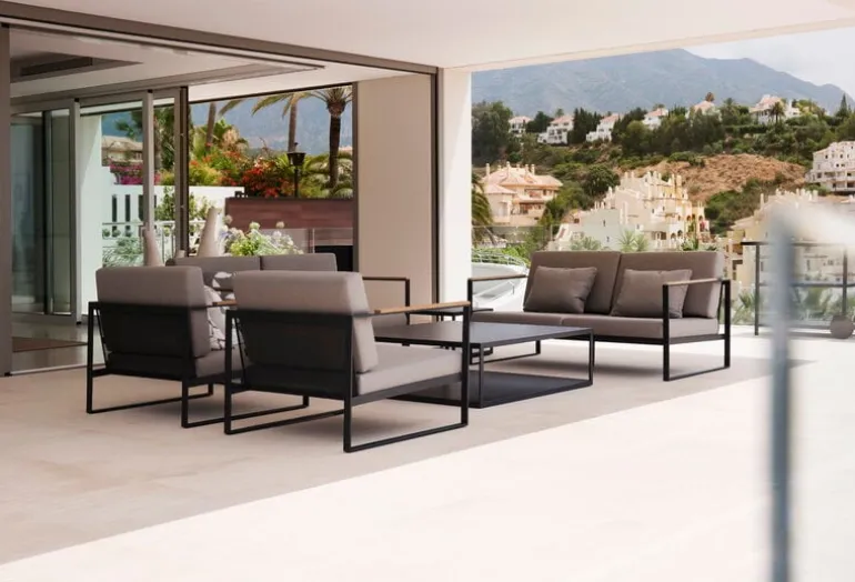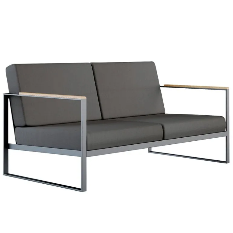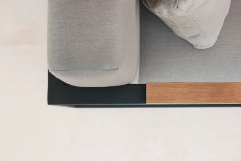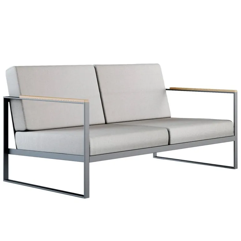 Röshults Garden Easy-soffa är ett modernt sätt att koppla av utomhus. Soffan har belagts med Sunbrella-tyg för att tåla fukt och lite regn.