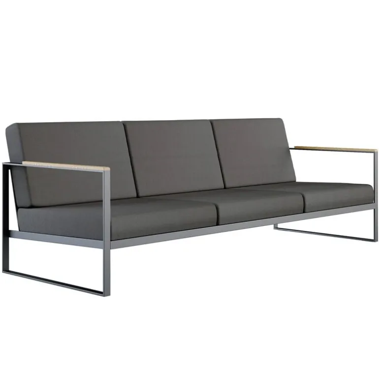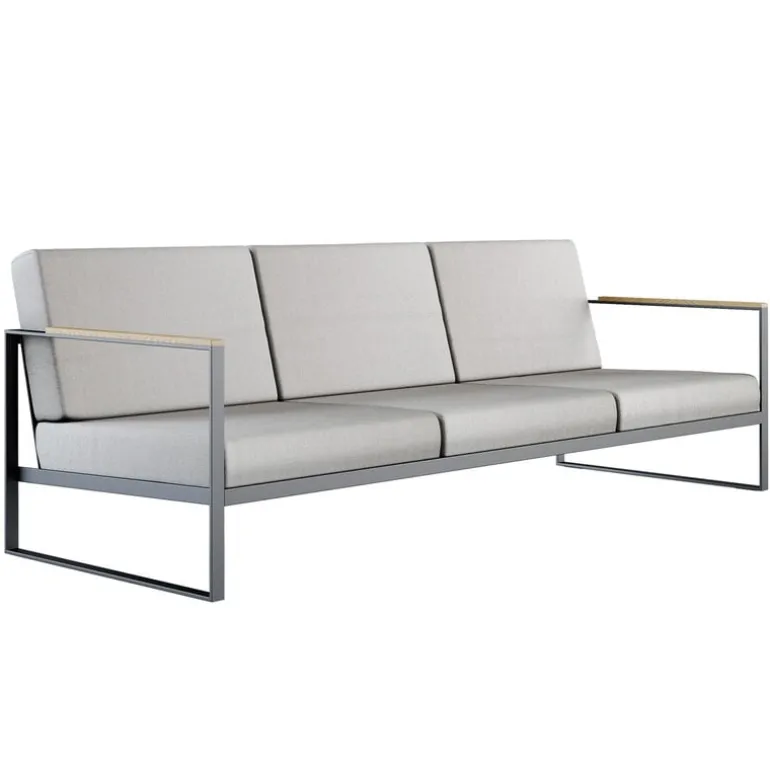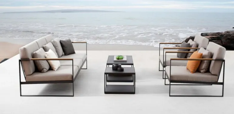 Röshults Garden Easy-soffa är ett modernt sätt att koppla av utomhus. Soffan har belagts med Sunbrella-tyg för att tåla fukt och lite regn.